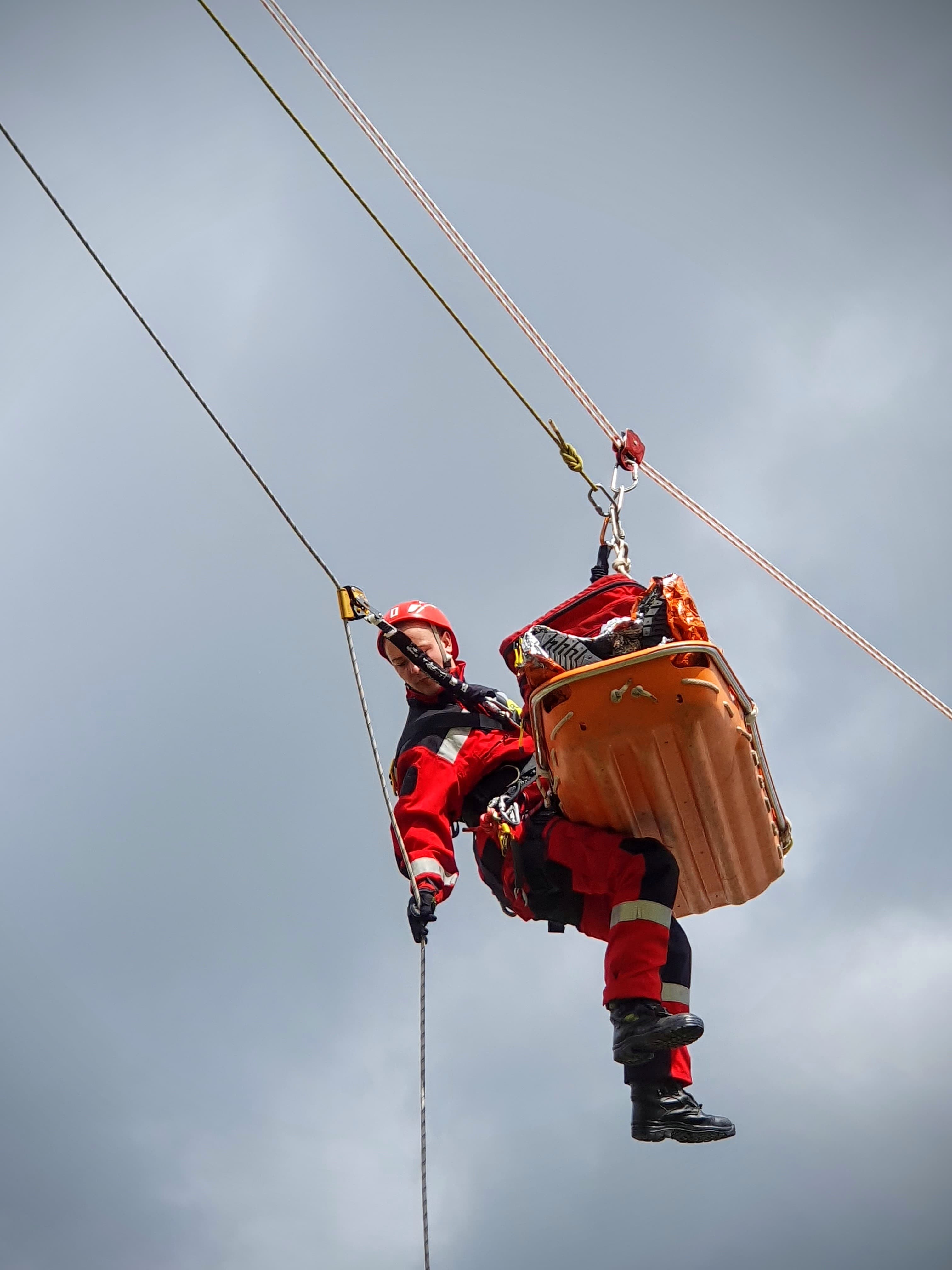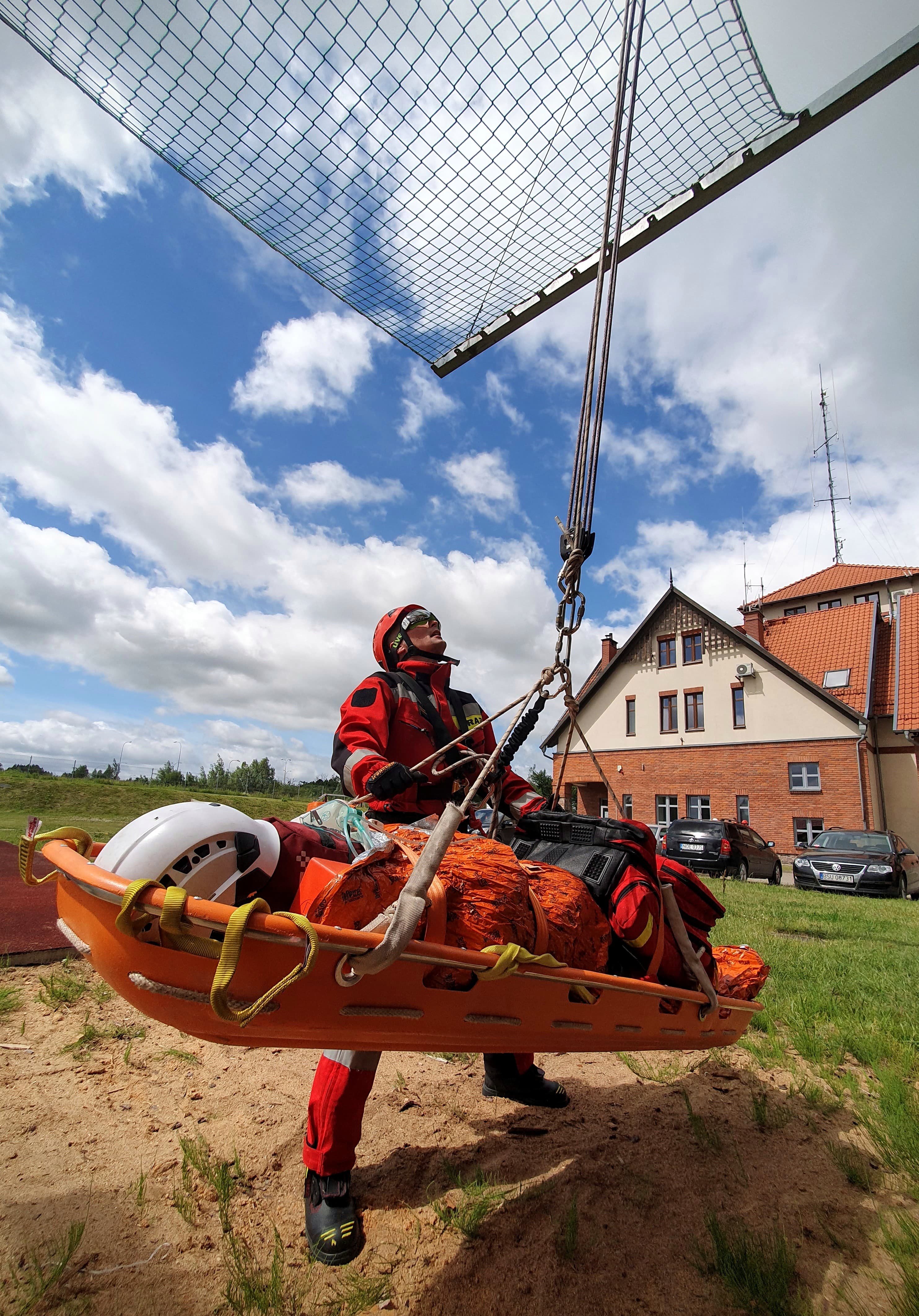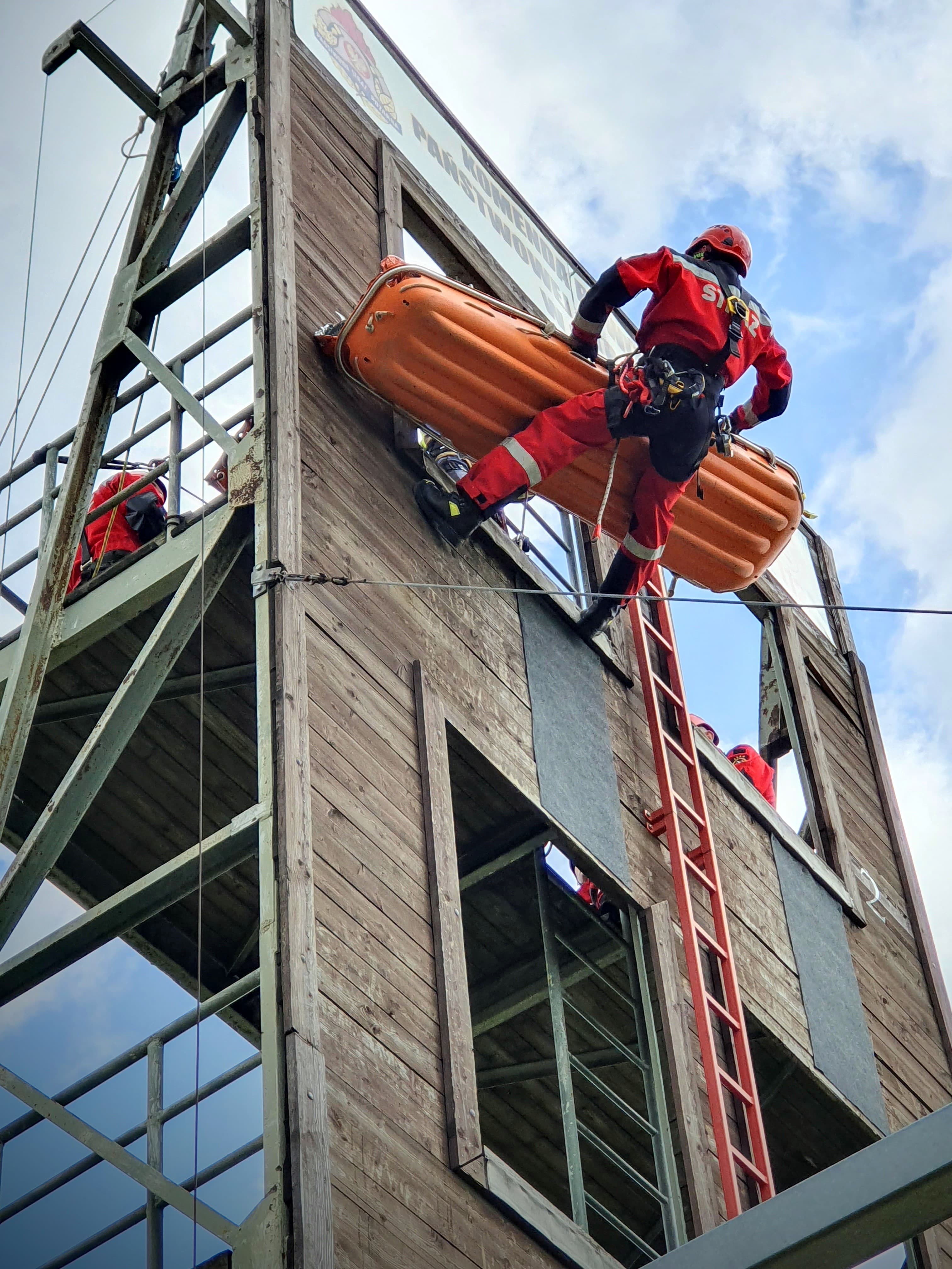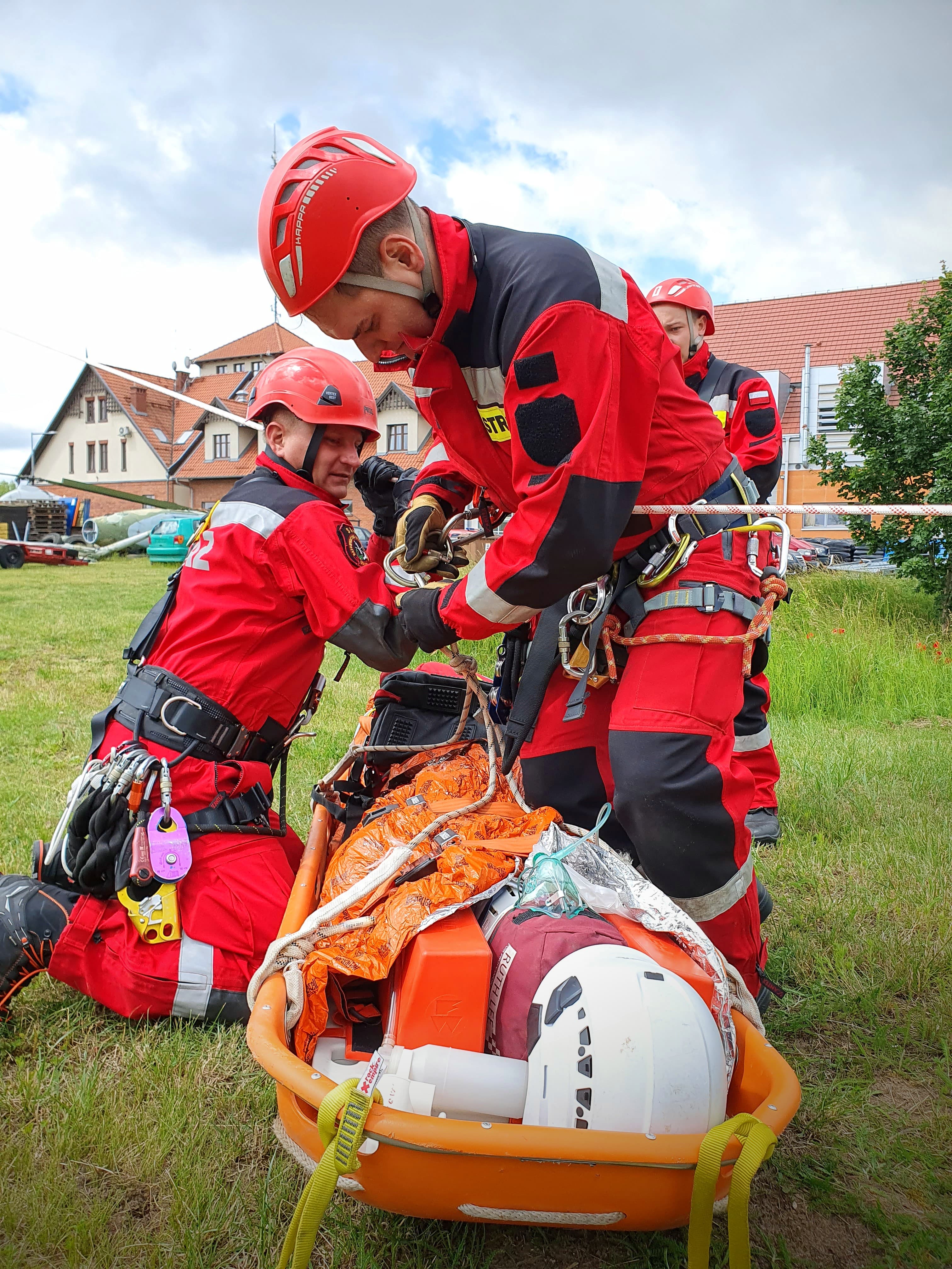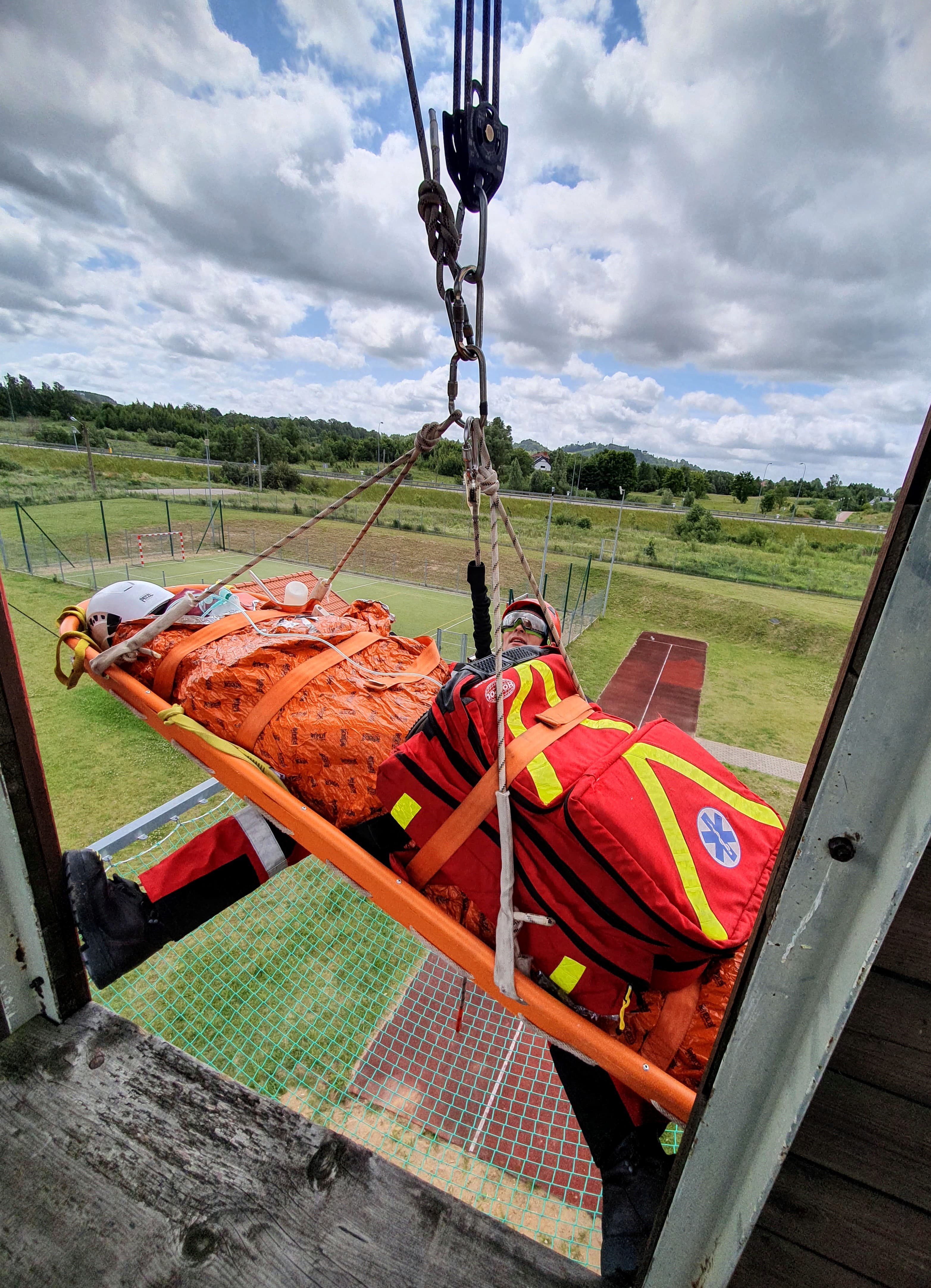 - Dotarcie przy pomocy technik linowych do osoby poszkodowanej po upadku z dachu budynku na dolną kondygnację obiektu (możliwość dotarcia jedynie z poziomu wyższego – brak schodów, drabiny) oraz udzielenie kwalifikowanej pierwszej pomocy (kpp) – poszkodowany przytomny, możliwy uraz kręgosłupa, zagrożenie wstrząsem hipowolemicznym.