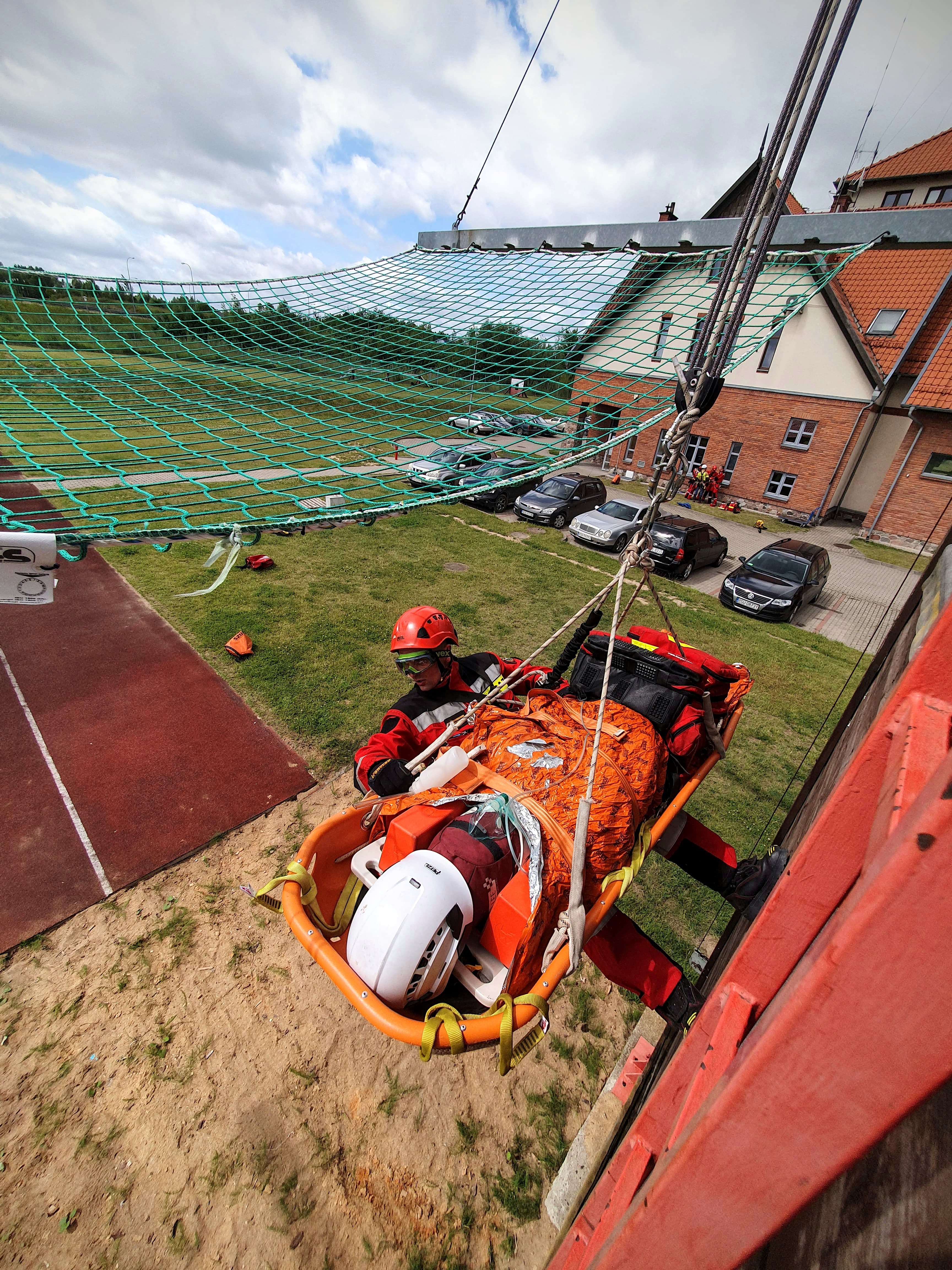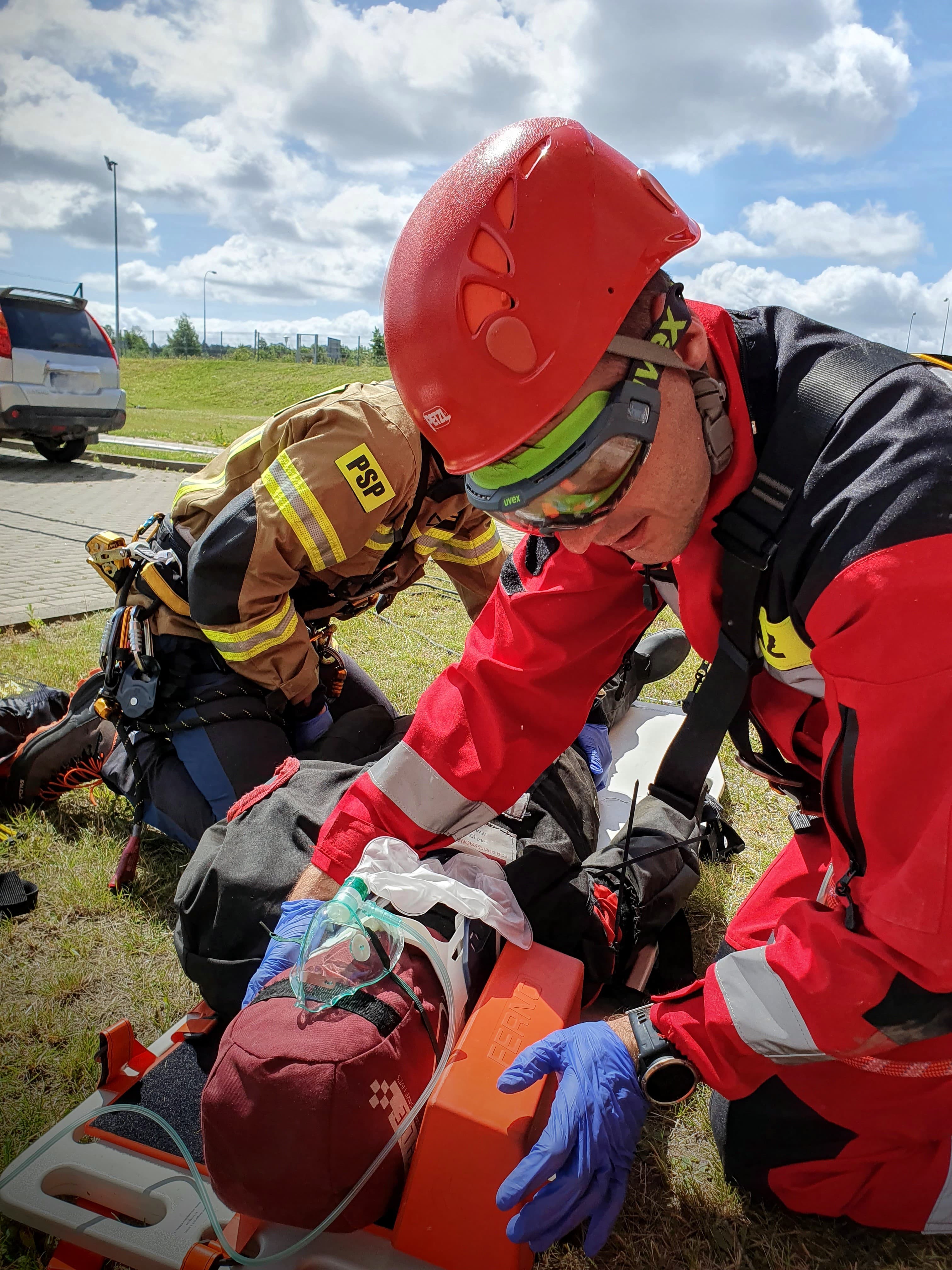 - Udzielanie kpp osobie poszkodowanej (w dalszym ciągu przytomny), odpowiednie zabezpieczenie (m.in. kołnierz ortopedyczny, nosze kubełkowe) oraz ewakuacja poszkodowanego na wyższy poziom budynku w celu dalszego przekazania Zespołowi Ratownictwa Medycznego (ZRM).