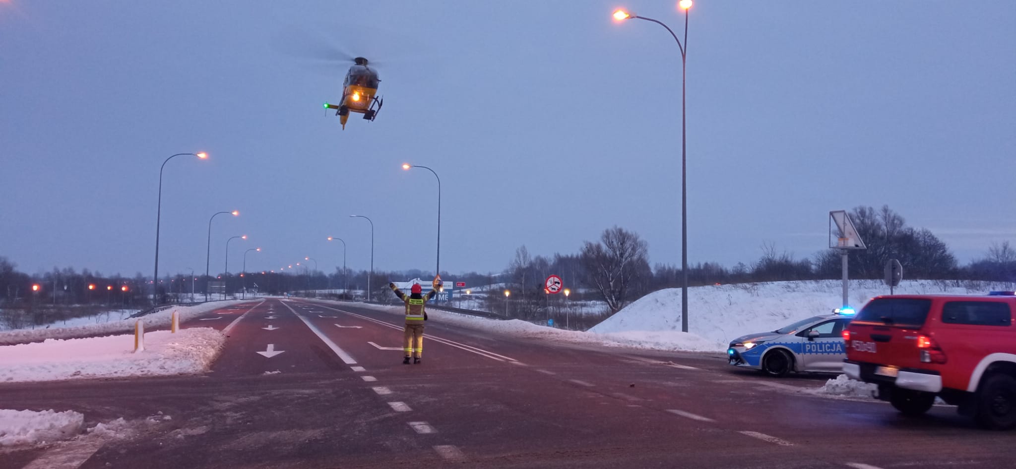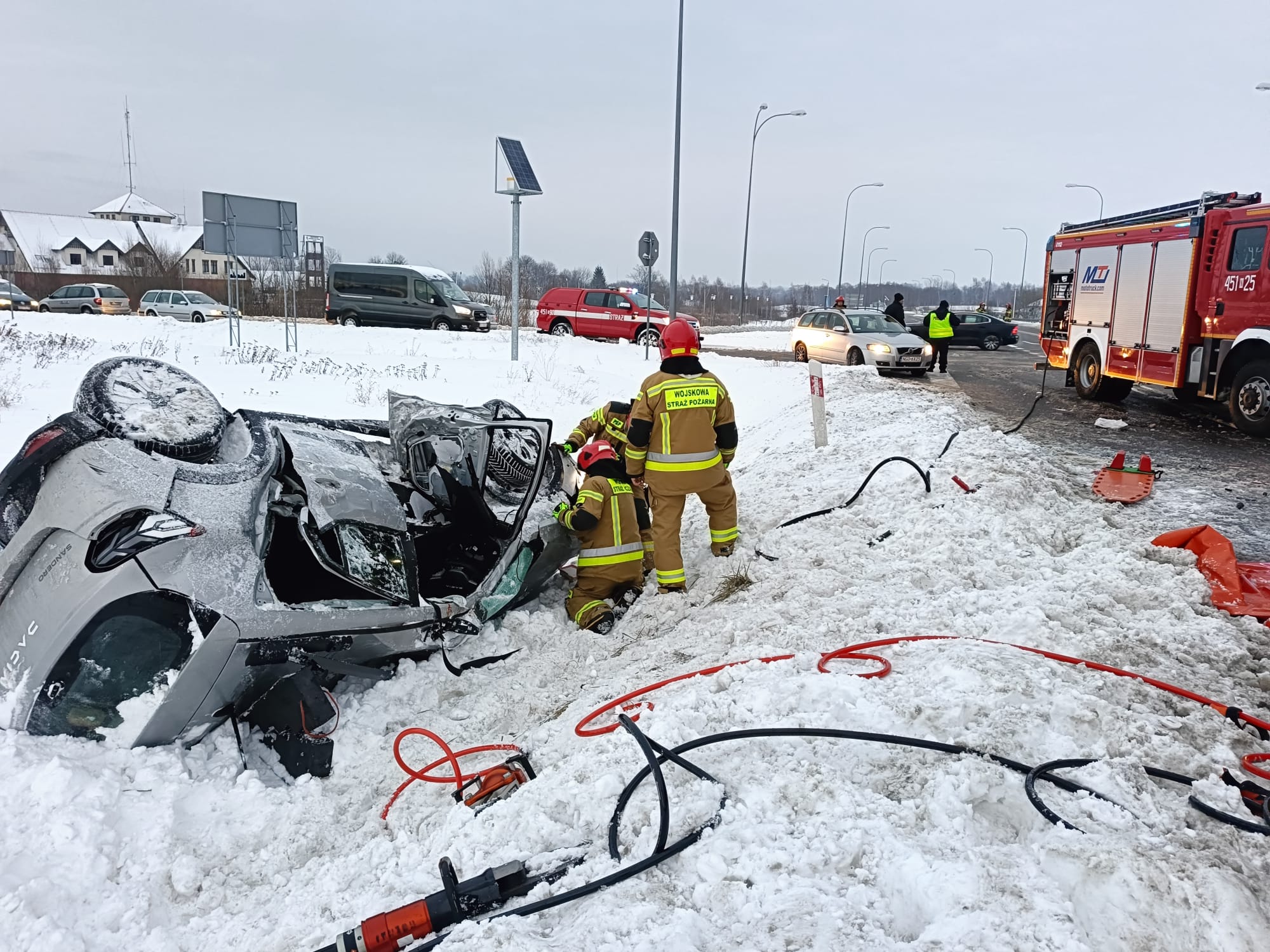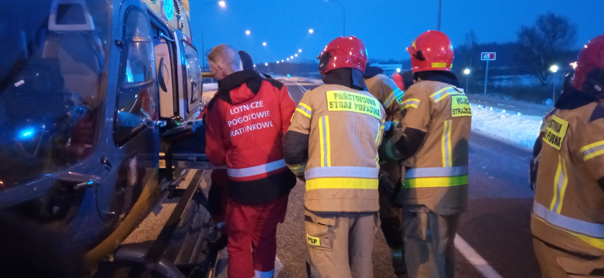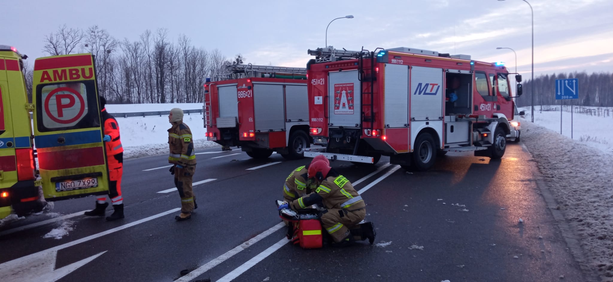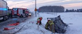 18 stycznia 2024 roku o godzinie 15:29 dyżurny stanowiska kierowania Komendanta Powiatowego Państwowej Straży Pożarnej w Gołdapi otrzymał zgłoszenie o zderzeniu samochodu osobowego z ciągnikiem siodłowym z naczepą na obwodnicy Gołdapi (skrzyżowanie drogi krajowej nr 65 z drogą wojewódzką nr 650). Do akcji zostały zadysponowane cztery zastępy z gołdapskiej komendy oraz zastęp Wojskowej Straży Pożarnej. Na miejscu okazało się, że autem osobowym jechały dwie osoby, które pozostawały uwięzione we wraku pojazdu, a ciężarówką podróżował jedynie kierowca (znajdujący się poza samochodem i nie zgłaszający żadnych dolegliwości). Przy użyciu narzędzi hydraulicznych uwolniono osoby poszkodowane i ewakuowano je w miejsce bezpieczne, gdzie została im udzielona dalsza pomoc medyczna. Obecny na miejscu akcji Zespół Ratownictwa Medycznego po przebadaniu wszystkich uczestników zdarzenia, przewiózł jedną z poszkodowanych do szpitala. Kolejna osoba została przetransportowana do podmiotu leczniczego śmigłowcem Lotniczego Pogotowia Ratunkowego. Działania strażaków polegały m.in. na zabezpieczeniu miejsca zdarzenia, udzieleniu pomocy medycznej osobom poszkodowanym, odłączeniu zasilania w pojazdach oraz pomocy Policji w kierowaniu ruchem drogowym i oświetlenia terenu akcji podczas prowadzonych czynności dochodzeniowo–śledczych.