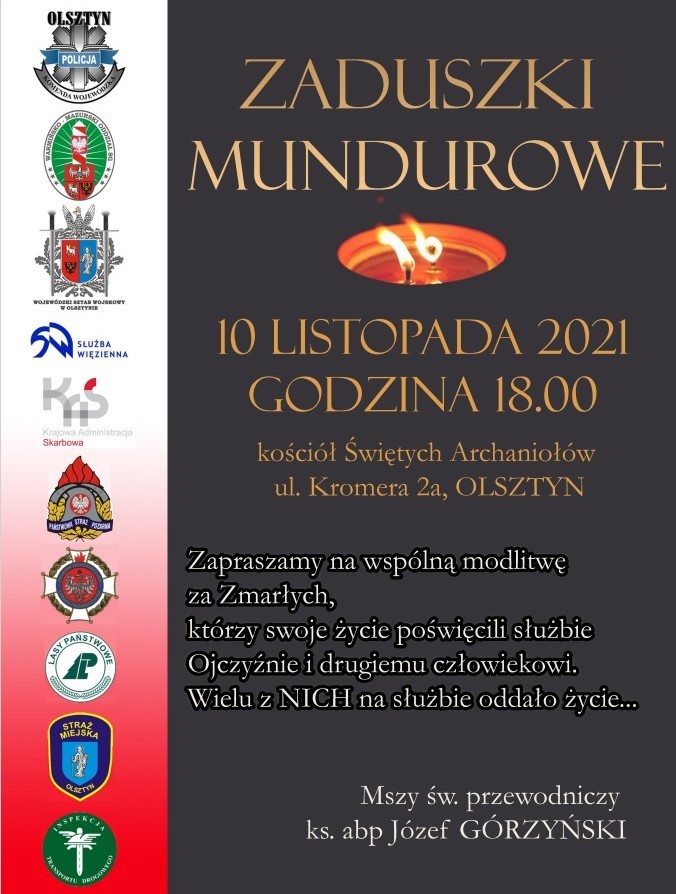 10 listopada 2021r. o godz. 18:00 w Kościele Świętych Archaniołów przy ul. Kromera 2a w Olsztynie zostanie odprawiona Msza Święta za zmarłych funkcjonariuszy i pracowników służb mundurowych woj. warmińsko–mazurskiego.