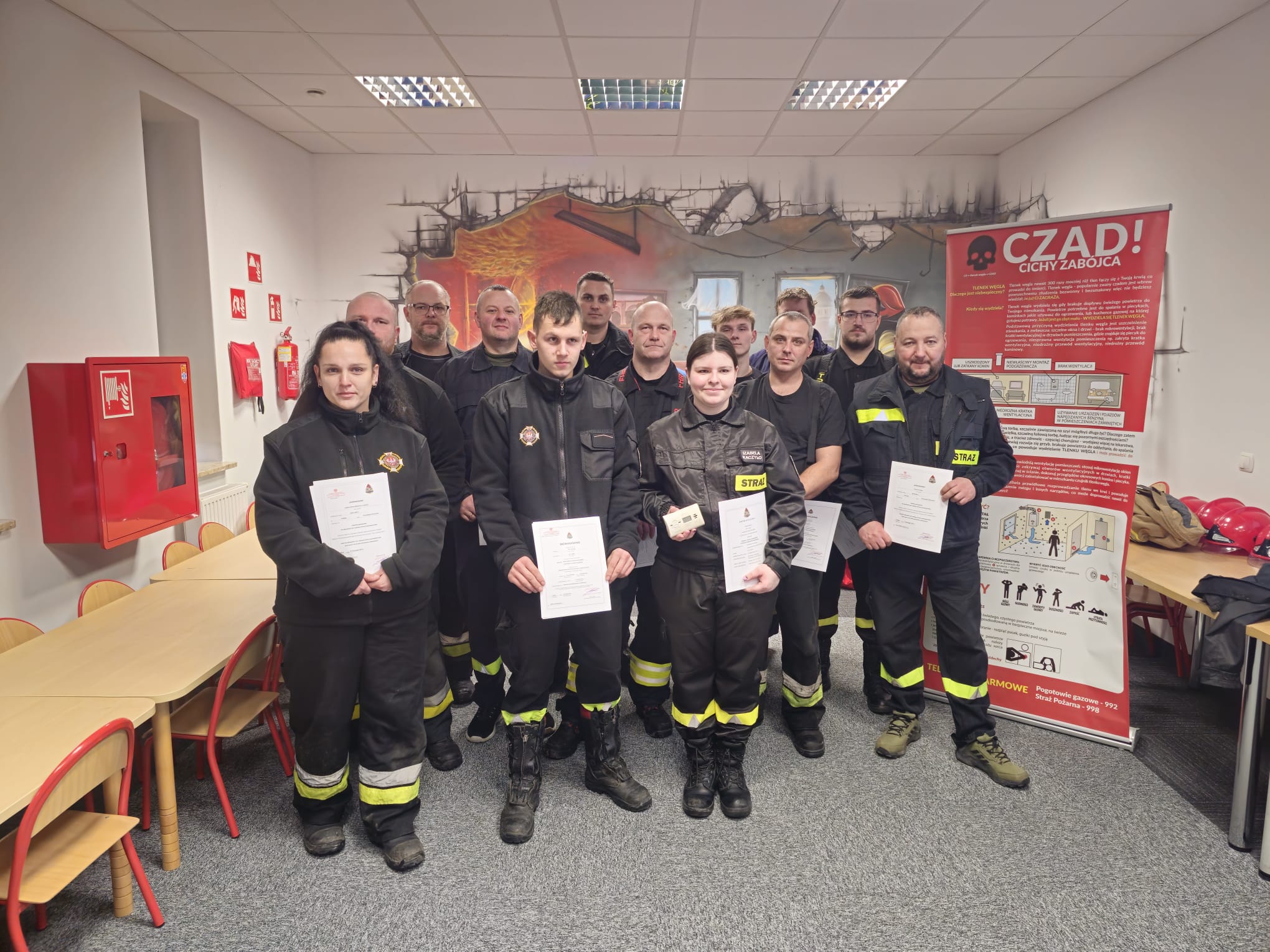 Podczas wręczania zaświadczeń funkcjonariusze KP PSP w Gołdapi przypomnieli świeżo upieczonym strażakom ratownikom OSP jak istotną rolę pełnią czujki tlenku węgla (CO) i dymu, w tym zwrócili uwagę na ostatnie zdarzenia w powiecie gołdapskim, podczas których czujka czadu zaalarmowała o zagrożeniu.