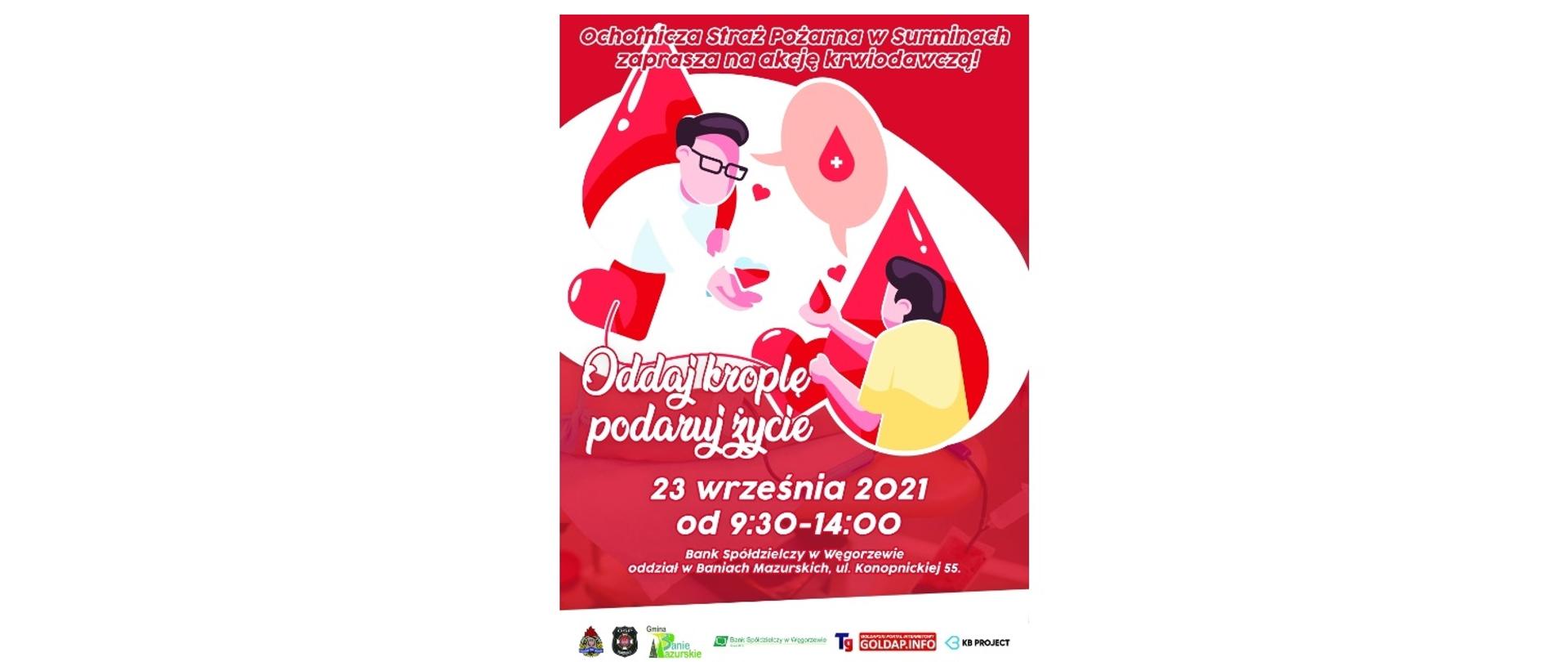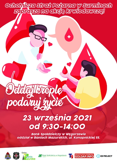 23 września 2021 roku w godz. 930–1400 w Oddziale Węgorzewskiego Banku Spółdzielczego w Baniach Mazurskich odbędzie się akcja krwiodawstwa organizowana przez Ochotniczą Straż Pożarną w Surminach we współpracy z Komendą Powiatową PSP w Gołdapi. Akcja odbędzie się z zachowaniem reżimu sanitarnego. Serdecznie zapraszamy wszystkich do wzięcia udziału w ww. przedsięwzięciu.