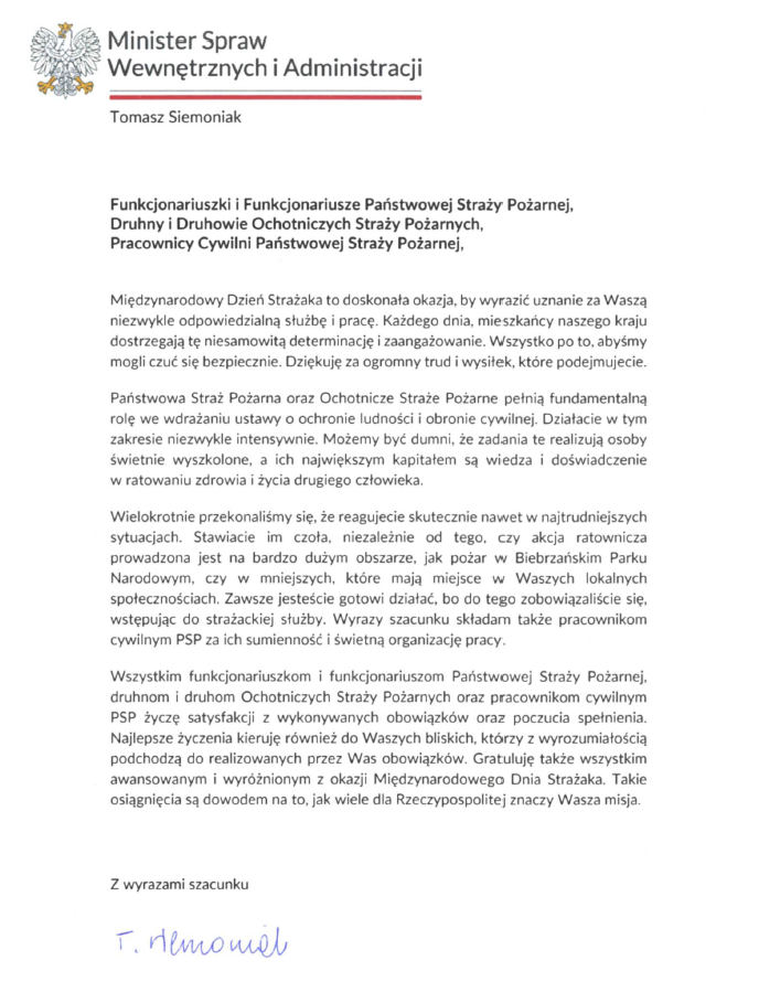 Wszystkim funkcjonariuszkom i funkcjonariuszom Państwowej Straży Pożarnej, druhnom i druhom Ochotniczych Straży Pożarnych oraz pracownikom cywilnym PSP życzę satysfakcji z wykonywanych obowiązków oraz poczucia spełnienia. Najlepsze życzenia kieruję również do Waszych bliskich, którzy z wyrozumiałością podchodzą do realizowanych przez Was obowiązków. Gratuluję także wszystkim awansowanym i wyróżnionym z okazji Międzynarodowego Dnia Strażaka. Takie osiągnięcia są dowodem na to, jak wiele dla Rzeczypospolitej znaczy Wasza misja.