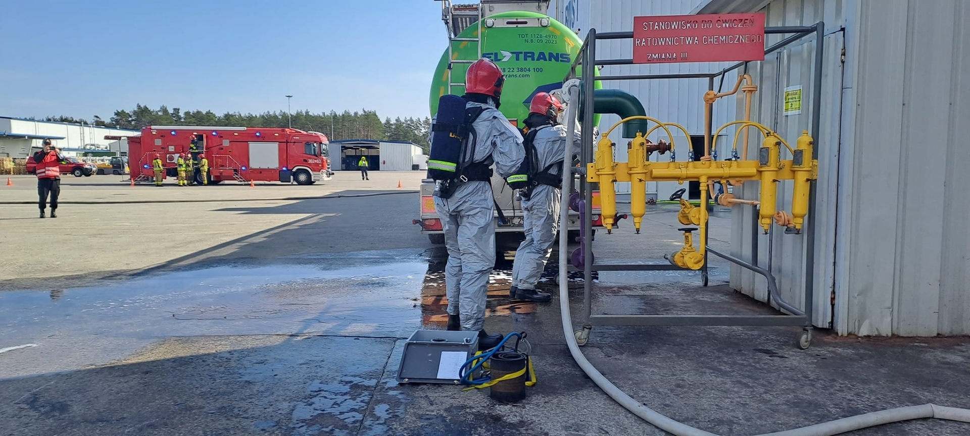 Scenariusz ćwiczeń zakładał powstanie pożaru w magazynie żywic, na skutek którego powstało rozszczelnienie się rurociągu instalacji z żywicą poliestrową. W wyniku zdarzenia poszkodowany został magazynier. Został on ochlapany żywicą, która znajdowała się na jego ubraniu i odsłoniętych częściach ciała. W celu ugaszenia pożaru zadysponowano zastępy z JRG Goleniów oraz pobliskich jednostek OSP.