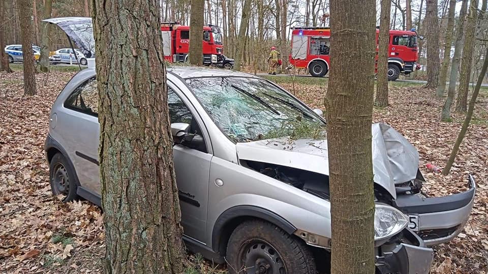 Na miejscu zdarzenia zastano samochód osobowy który wypadł z drogi i uderzył w drzewo. Pojazdem podróżowała 1 osoba, meżczyzna który z urazem klatki piersiowej został zabrany przez ZRM