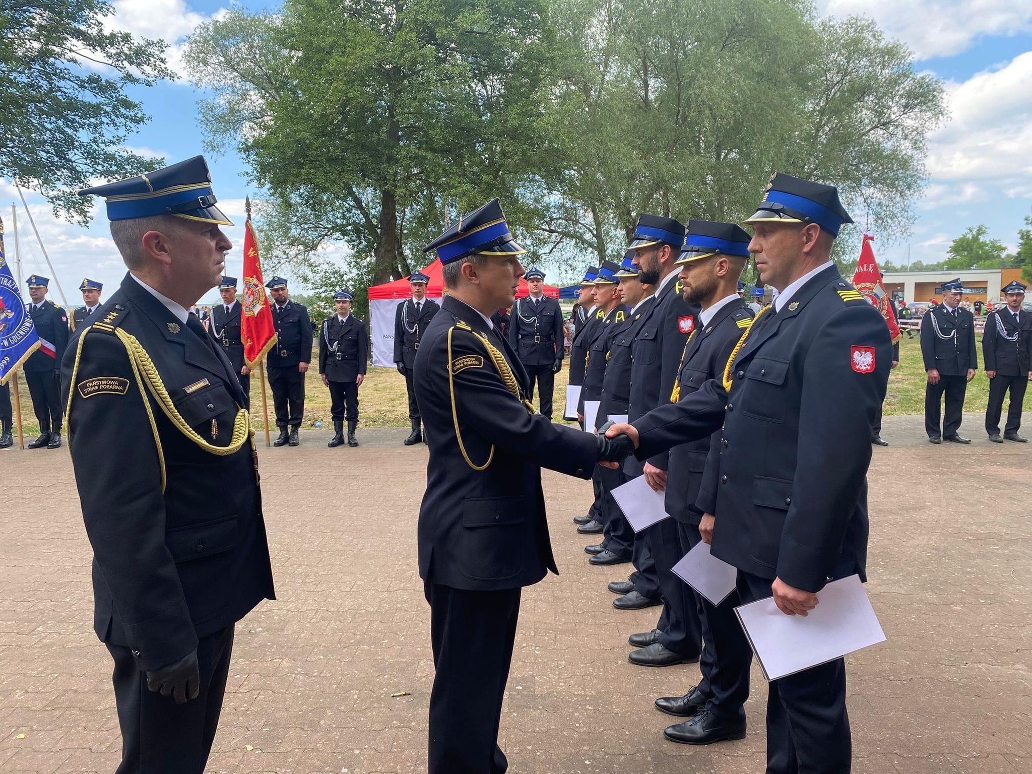 Następnie p.o. Komendanta Powiatowego Państwowej Straży Pożarnej w Goleniowie bryg. Piotr Tuzimek oraz Prezes Zarządu Oddziału Powiatowego Związku Ochotniczych Straży Pożarnych Rzeczypospolitej Polskiej w Goleniowie druh Artur Konior przywitali zaproszonych gości.