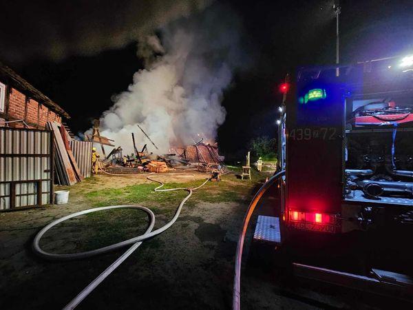 Po dojeździe pierwszego zastępu straży pożarnej na miejsce, kierujący działaniem ratowniczym potwierdził zdarzenie. Budynek gospodarczy cały objęty był ogniem.