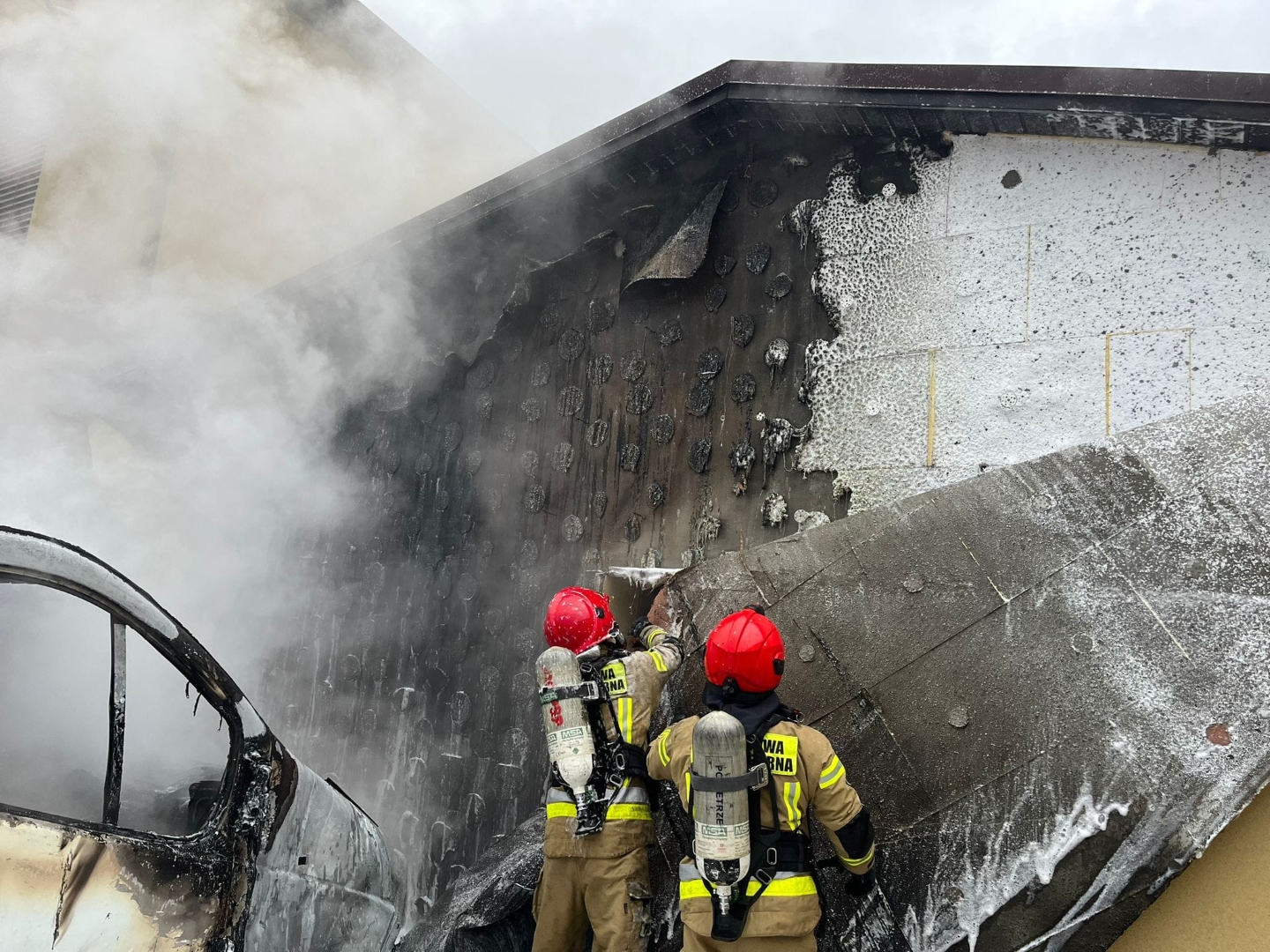 Dalsze działania polegały na dezaktywacji pojazdów oraz ich dogaszaniu, a także pracach rozbiórkowych na elewacji oraz wewnątrz budynku. W celu wykluczenia istnienia zarzewi ognia budynek oraz pojazdy sprawdzono kamerą termowizyjną , a cały obiekt przewietrzono przy pomocy wentylatora oddymiającego i sprawdzono za pomocą miernika wielogazowego. Na tym działania straży pożarnej zakończono.