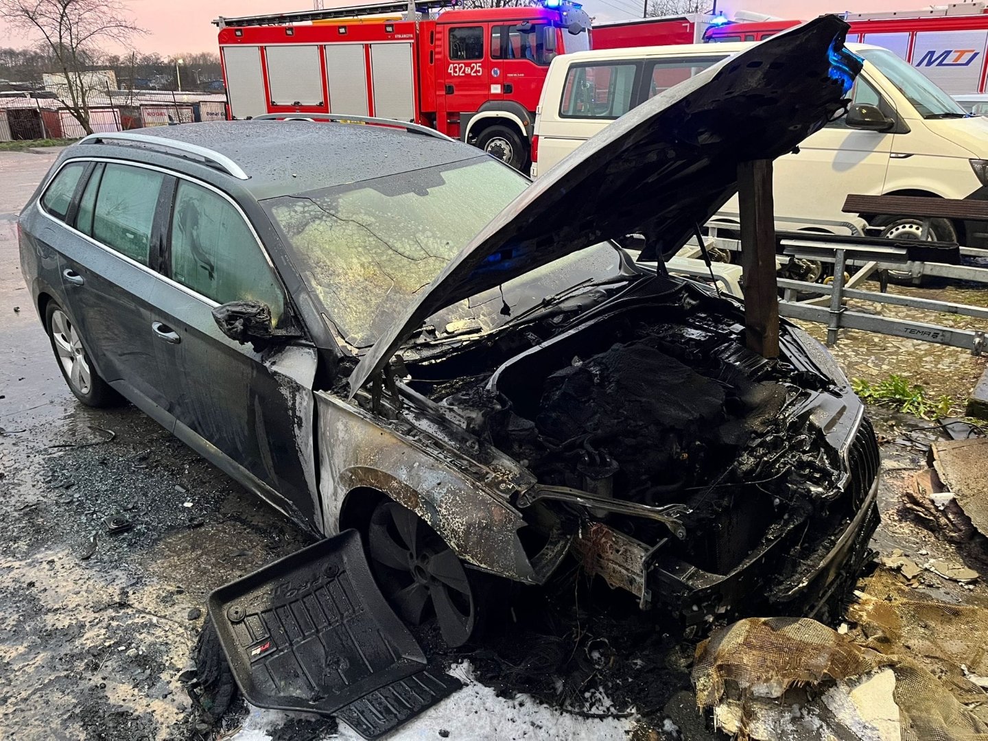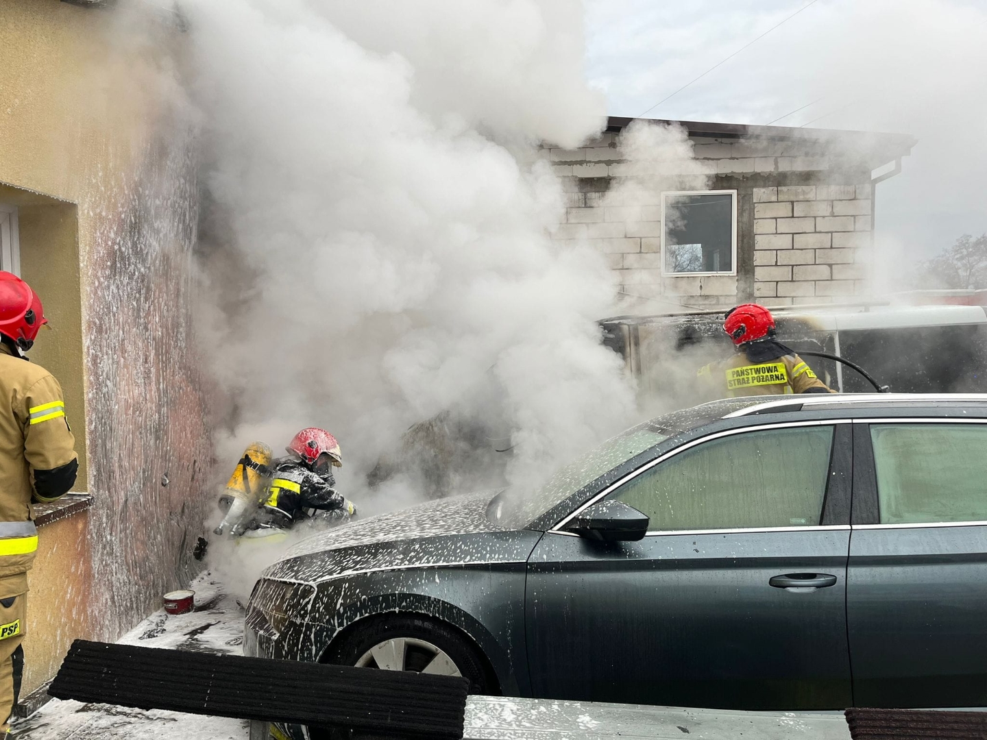 W chwili przybycia pierwszego zastępu na miejsca zdarzenia zastano palące się dwa samochody osobowe oraz elewacje na ścianie szczytowej budynku.
