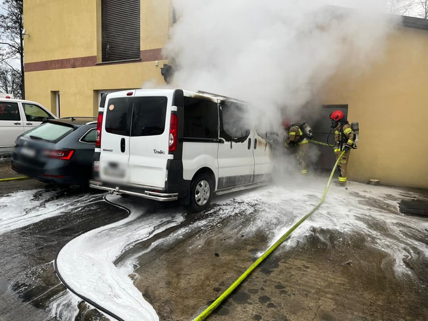 Pierwsze podjęte działania polegały na zabezpieczeniu i oświetleniu miejsca zdarzenia oraz podaniu trzech prądów gaśniczych piany przez strażaków zabezpieczonych w sprzęt ochrony dróg oddechowych na palące się samochody oraz elewację.