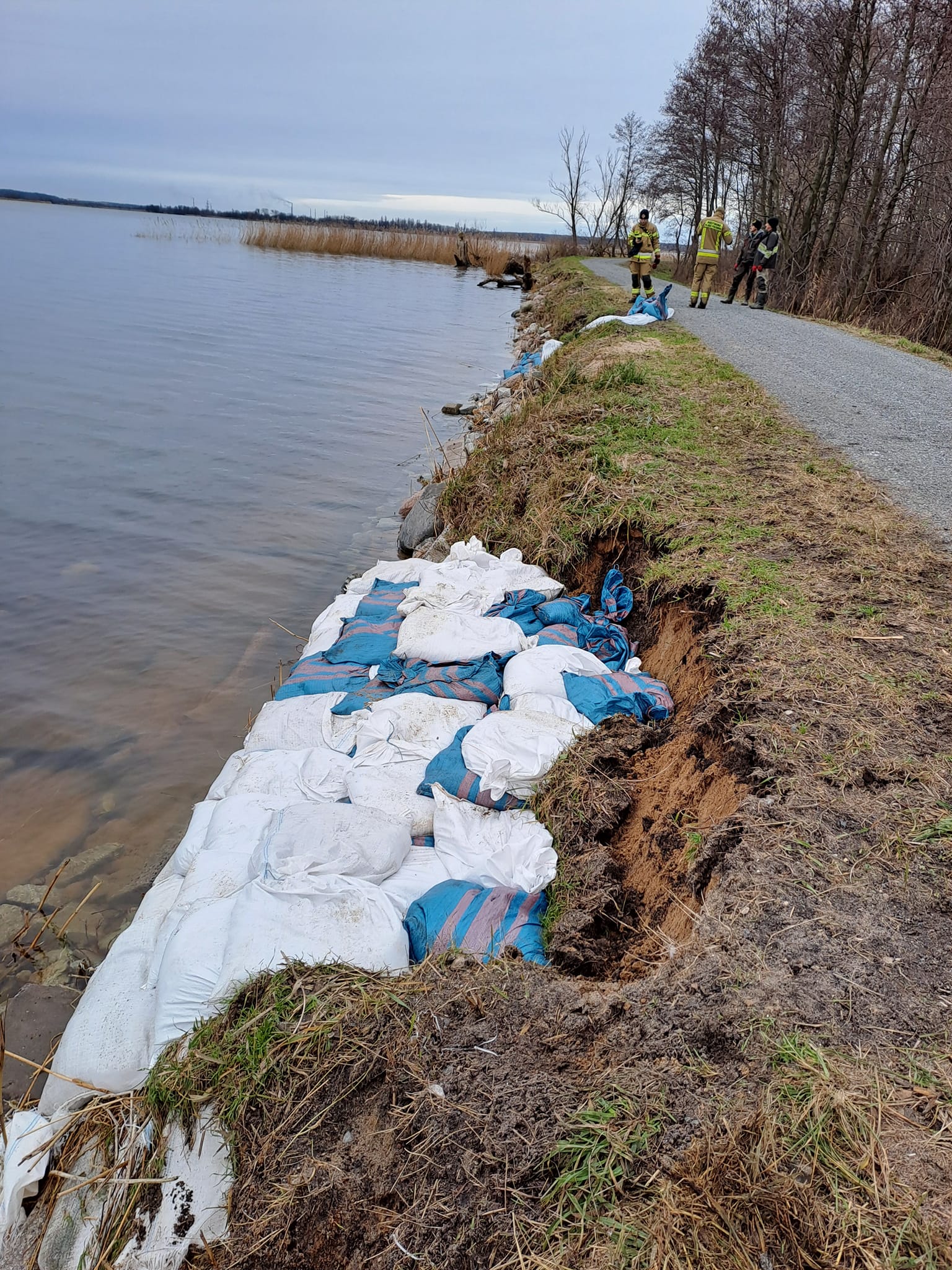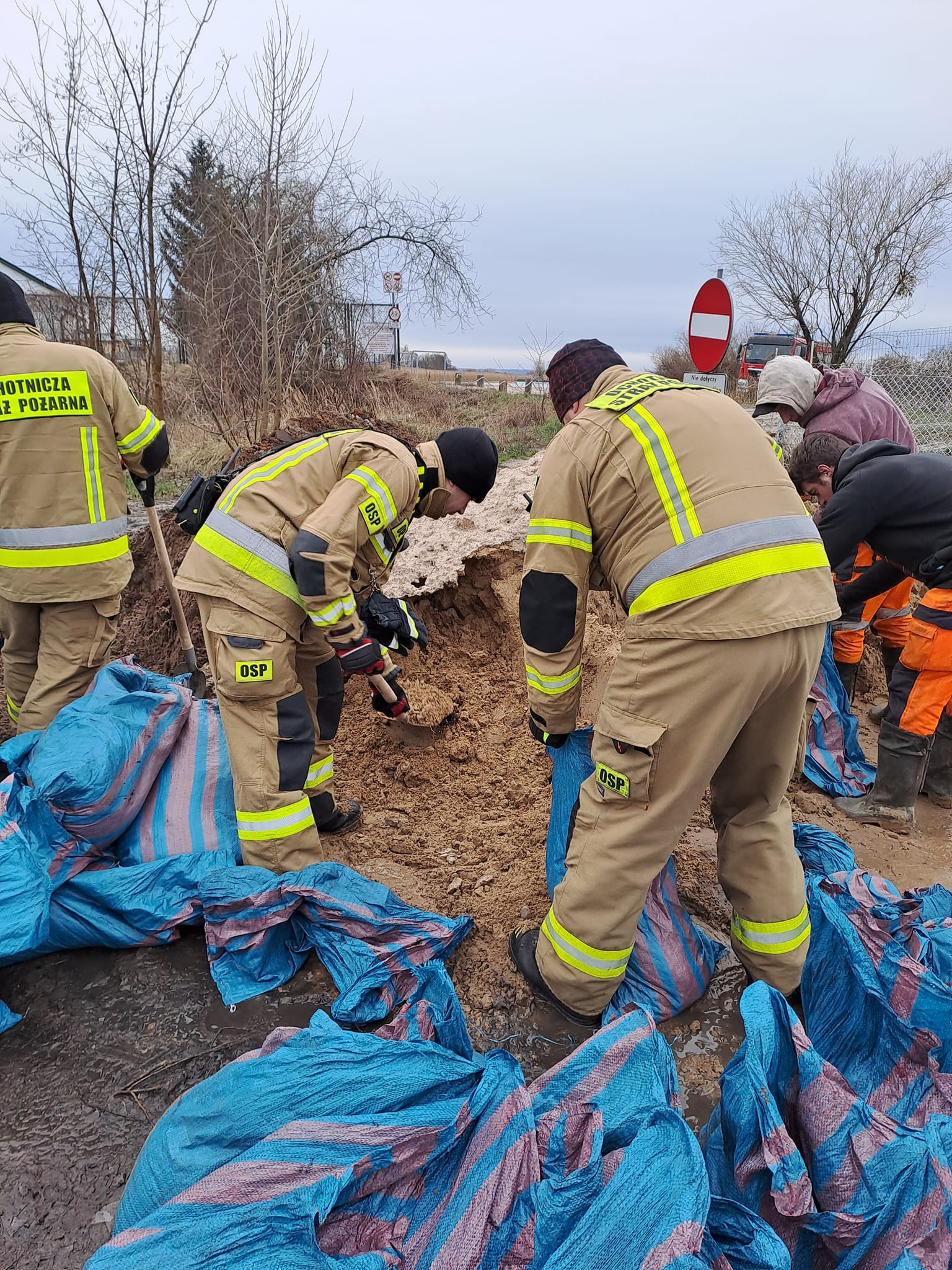 Od godziny 9:01 strażacy z JRG Goleniów i OSP Lubczyna wspólnie z pracownikami Wody Polskie biorą udział w umacnianiu wału przeciwpowodziowego w okolicach Lubczyny.