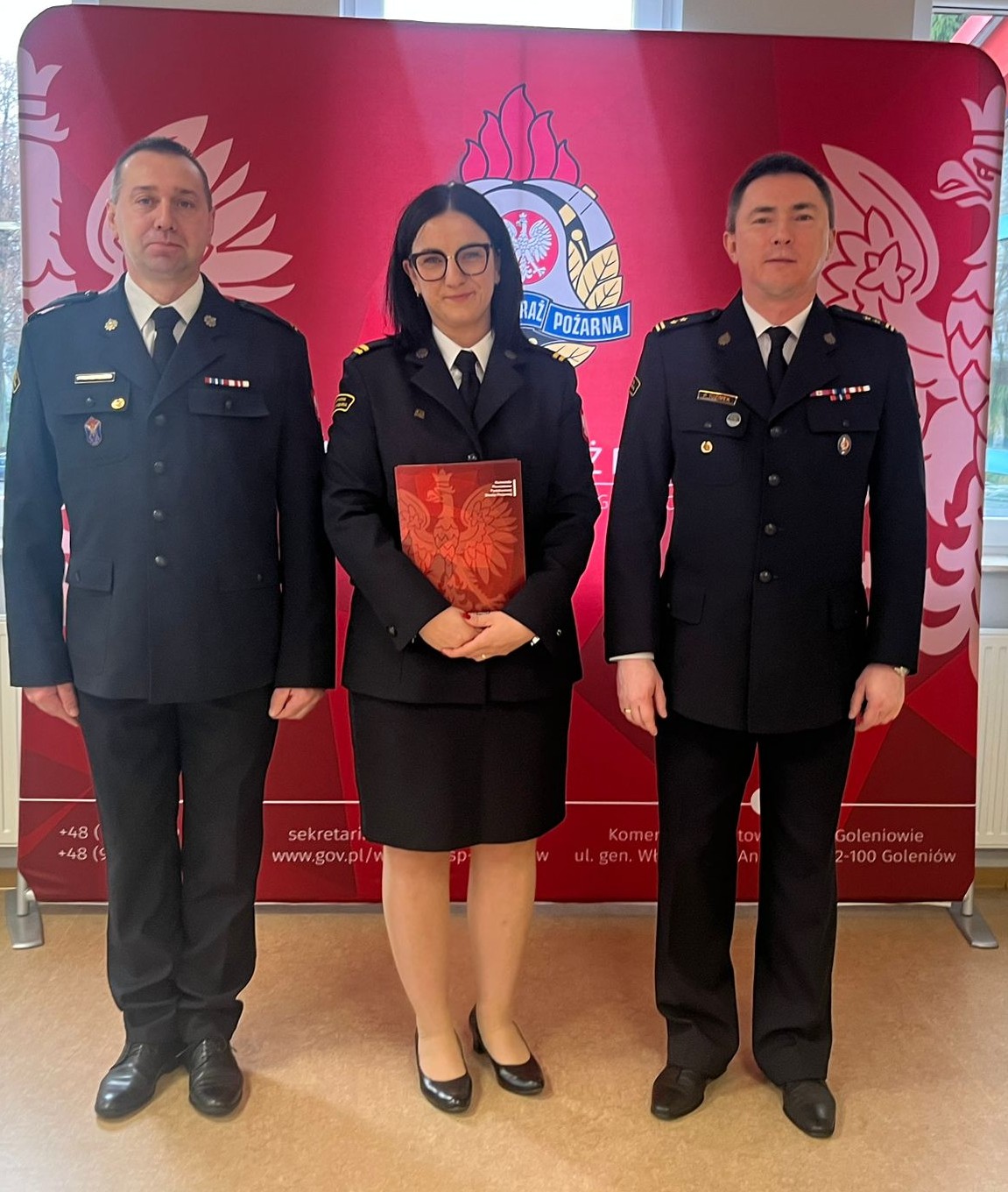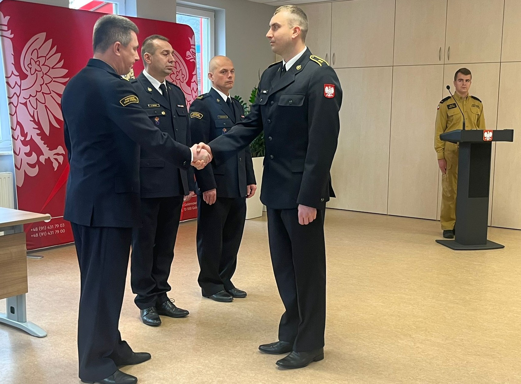 Uroczystość rozpoczęła się złożeniem meldunku Komendantowi Powiatowemu Państwowej Straży Pożarnej w Goleniowie bryg. Piotrowi Tuzimkowi przez dowódcę uroczystości st. asp. Krzysztofa Olszewskiego.
