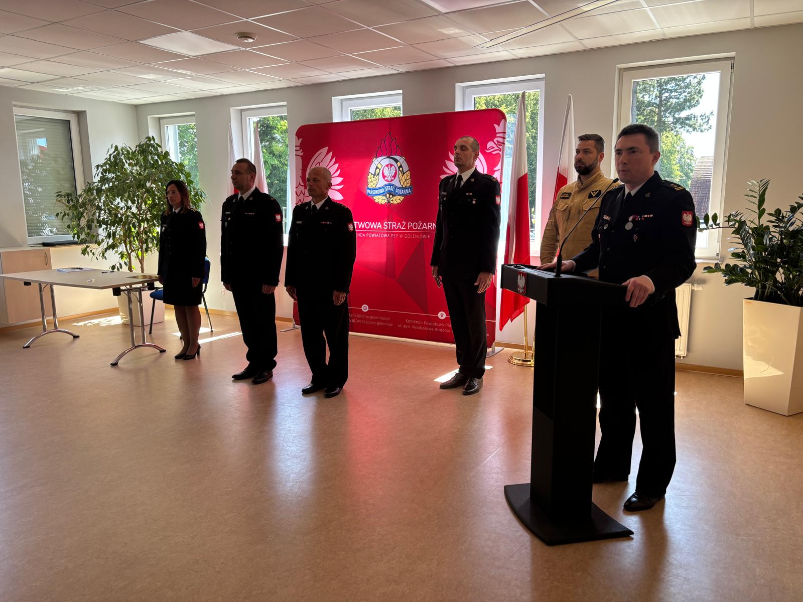 Uroczystość rozpoczęła się złożeniem meldunku Komendantowi Powiatowemu Państwowej Straży Pożarnej w Goleniowie bryg. Piotrowi Tuzimkowi przez dowódcę uroczystości mł. bryg. Bartosza Artyńskiego.