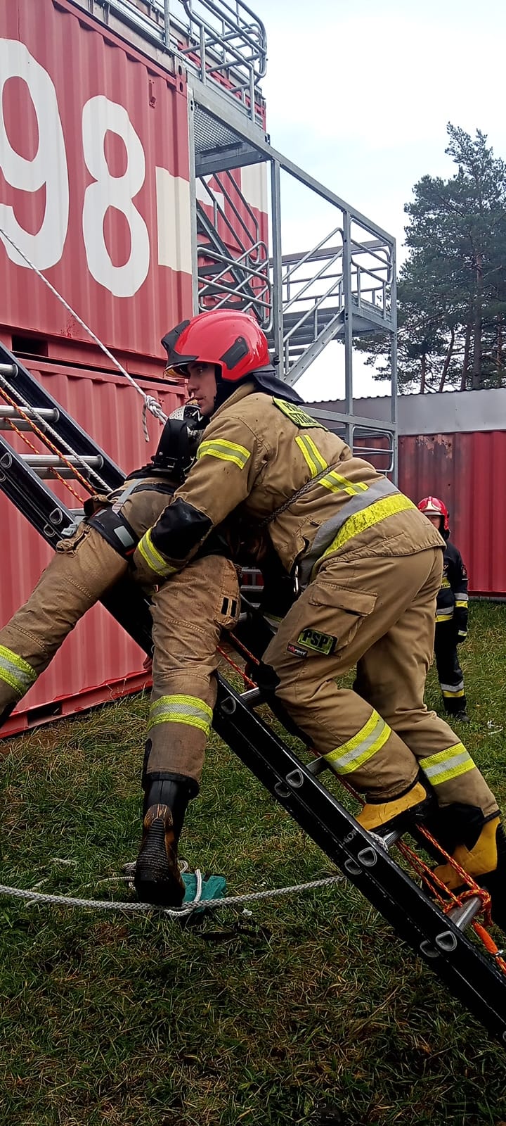 - Ewakuacja poszkodowanych oraz ratowników z wykorzystaniem drabin pożarniczych.