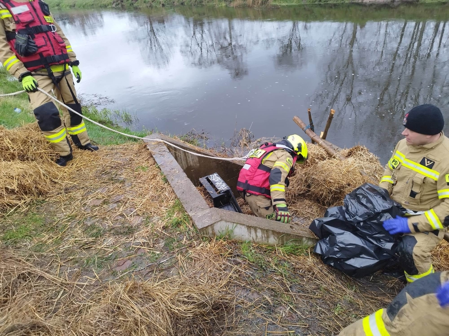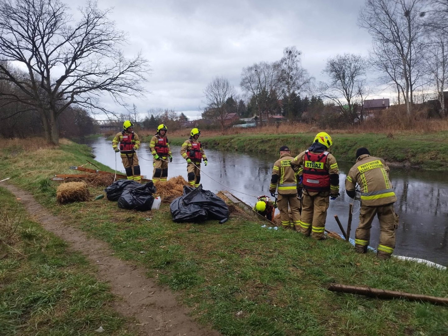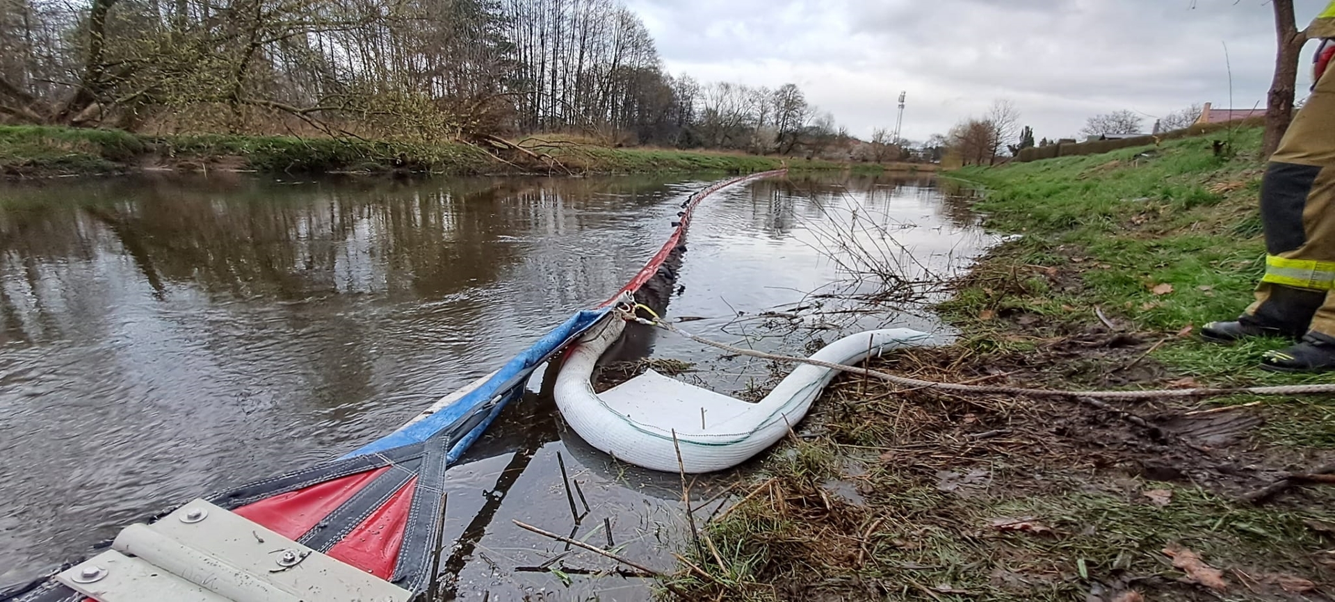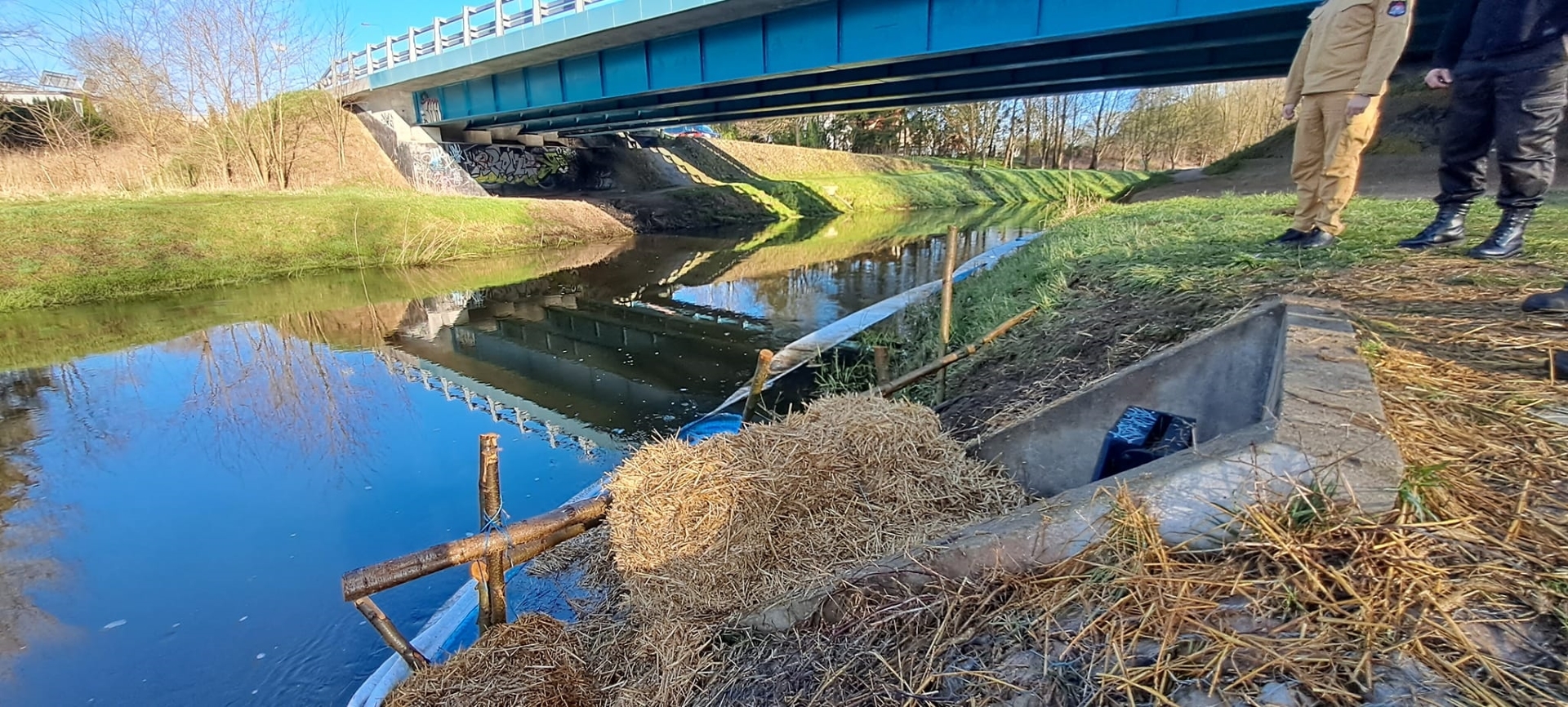 Na miejsce zdarzenia przybyli również pracownicy wydziału ochrony środowiska z Urzędu Gminy Goleniów, Policja oraz Straż Miejska. Policjanci oraz strażnicy miejscy próbowali ustalić miejsce w którym substancja dostała się do instalacji burzowej. Po ustaniu opadów przebudowano zaporę z rękawów sorpcyjnych - dołożono na brzegu rzeki drewniane faszyny, które wypełniono snopkami słomy.