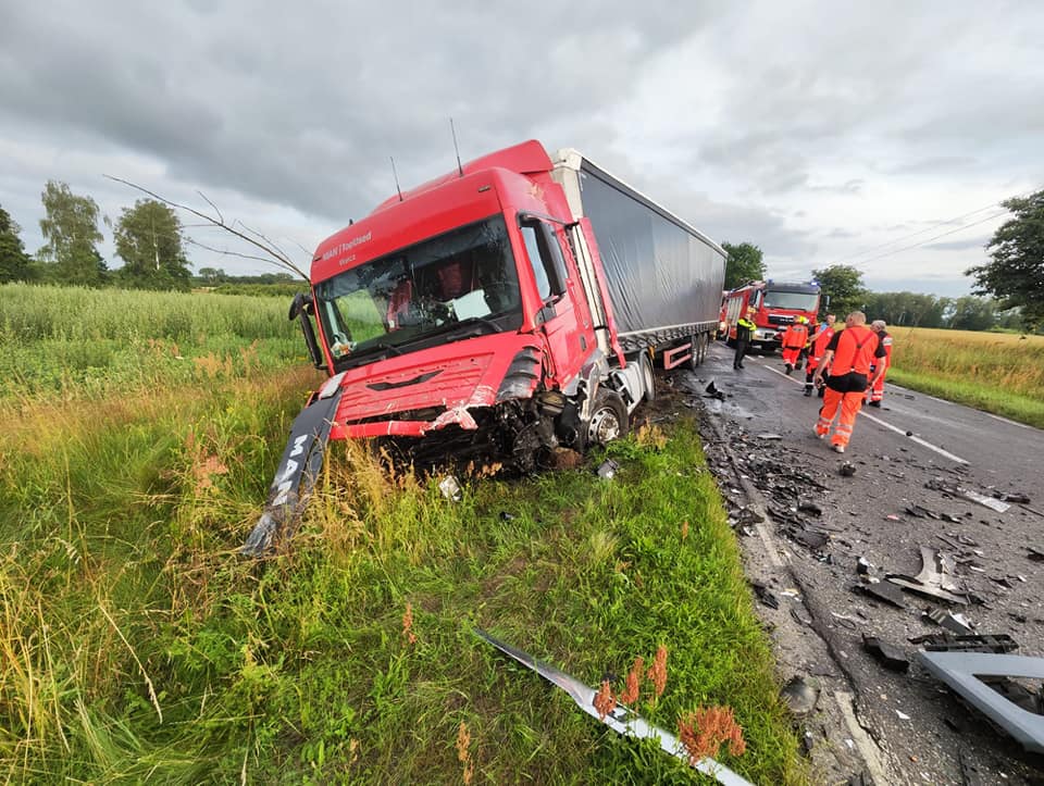 Kierowca samochodu ciężarowego samodzielnie opuścił pojazd przed przyjazdem służb, natomiast kierowca pojazdu osobowego który był zakleszczony w pojeździe, w wyniku odniesionych obrażeń poniósł śmierć.