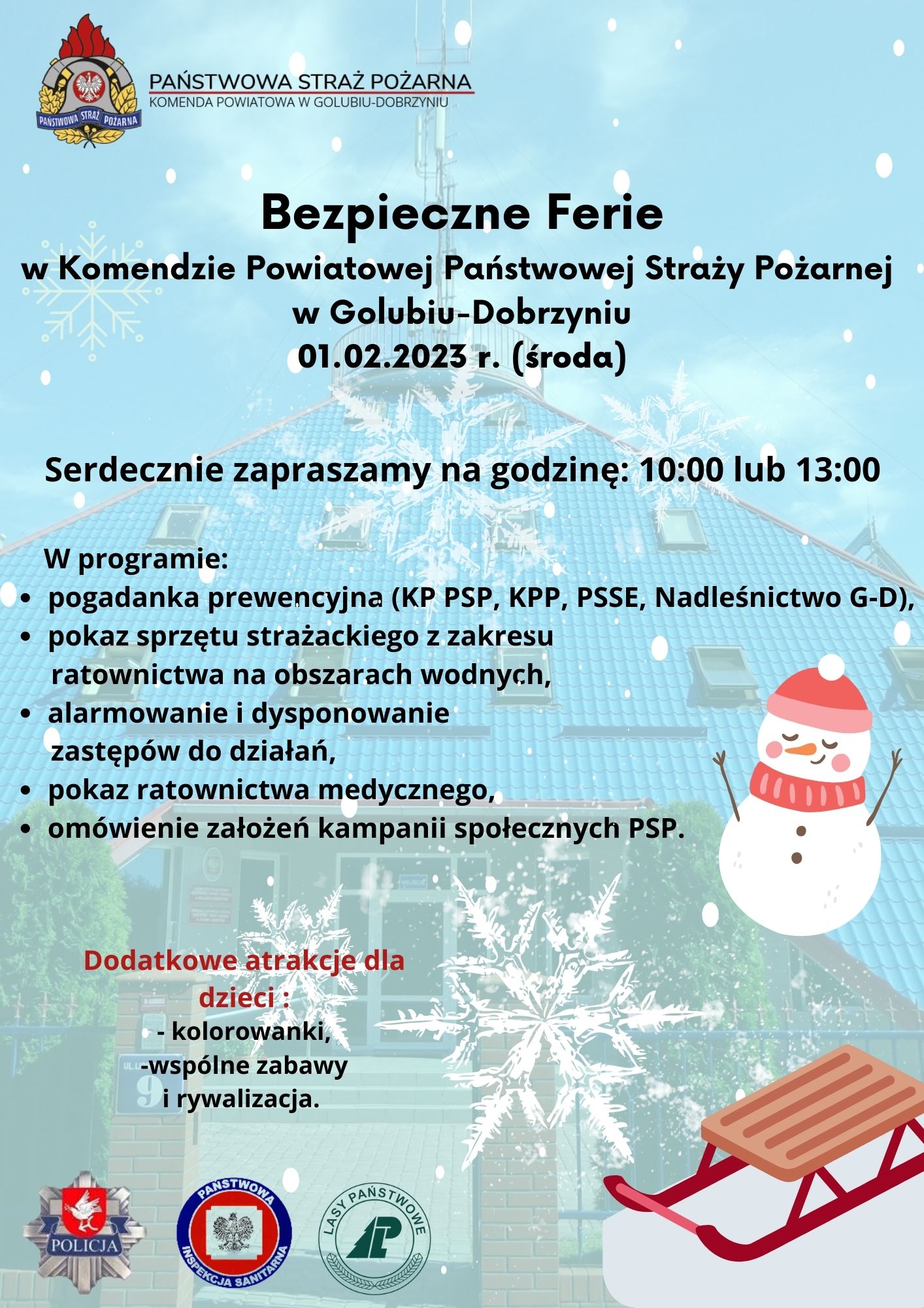 Niebawem dzieci i młodzież w naszym województwie rozpoczną upragnione ferie zimowe. 1 lutego 2023 r. w ramach akcji „Bezpieczne Ferie ze Strażakami z Komendy Powiatowej PSP w Golubiu-Dobrzyniu” serdecznie zapraszamy do odwiedzenia Komendy Powiatowej PSP w Golubiu-Dobrzyniu. Funkcjonariusze zaznajomią zwiedzających z pracą strażaka, sprzętem na wyposażeniu PSP, udzielą praktycznych porad na temat radzenia sobie w sytuacjach zagrożenia.