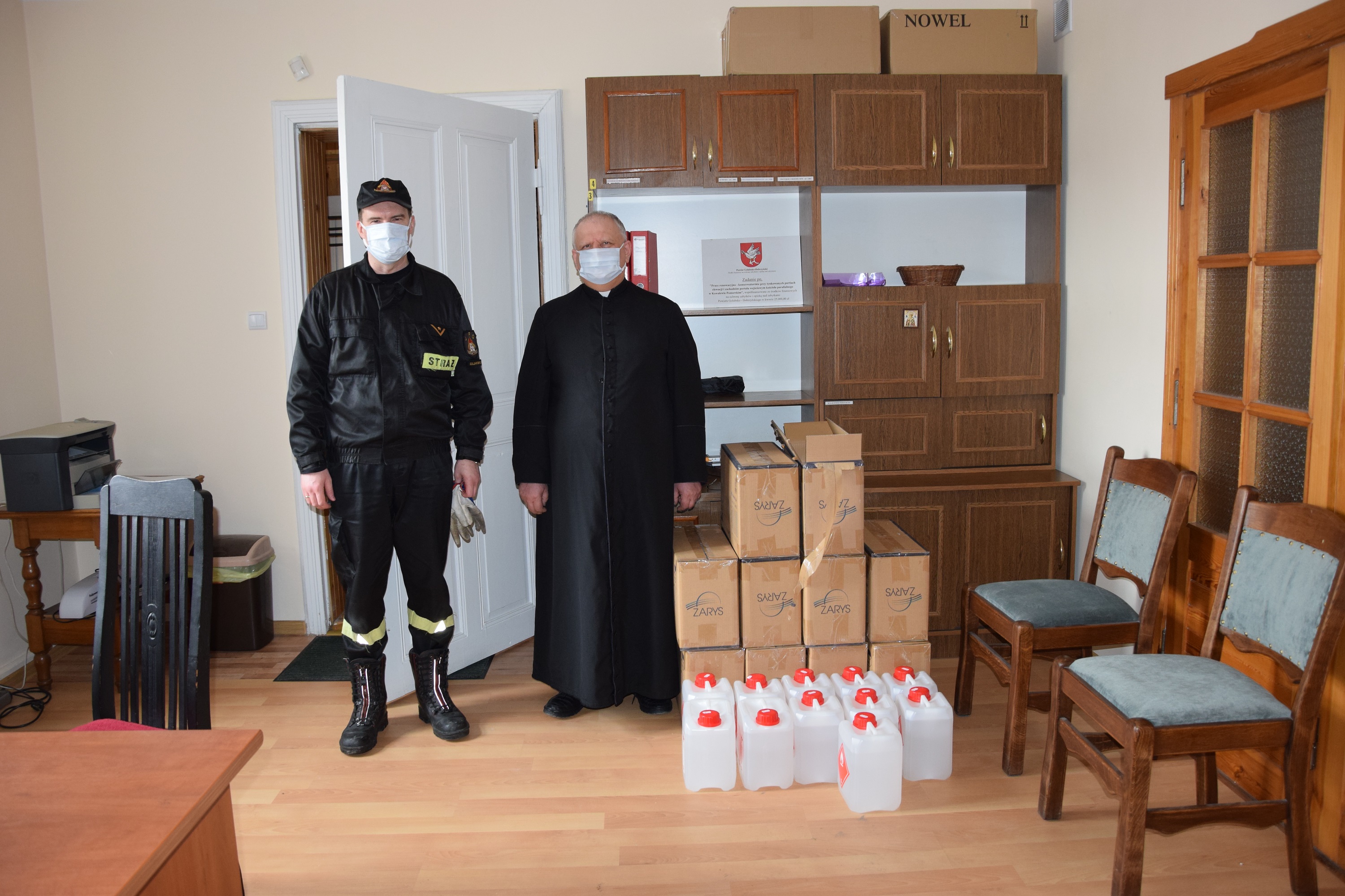 w Golubiu-Dobrzyniu dostarczyli do 18 parafii łącznie 85 000 sztuk maseczek ochronnych oraz 480 litrów płynu do dezynfekcji.