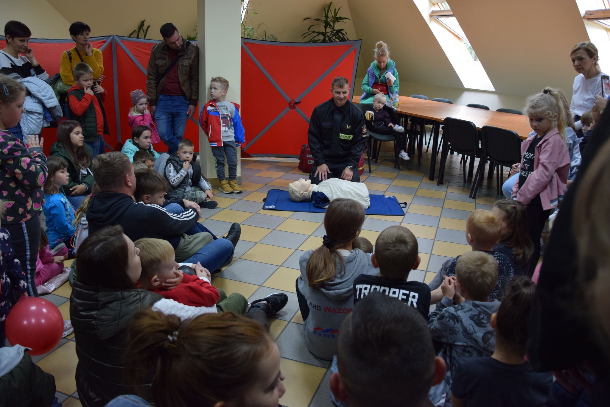 Po pokazie ratownictwa technicznego osobie poszkodowanej, która została ewakuowana z pojazdu została udzielona pierwsza pomoc. Strażak ratownik przeprowadził pokaz kwalifikowanej pierwszej pomocy - resuscytacji krążeniowo-oddechowej z użyciem defibrylatora.