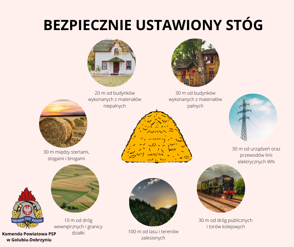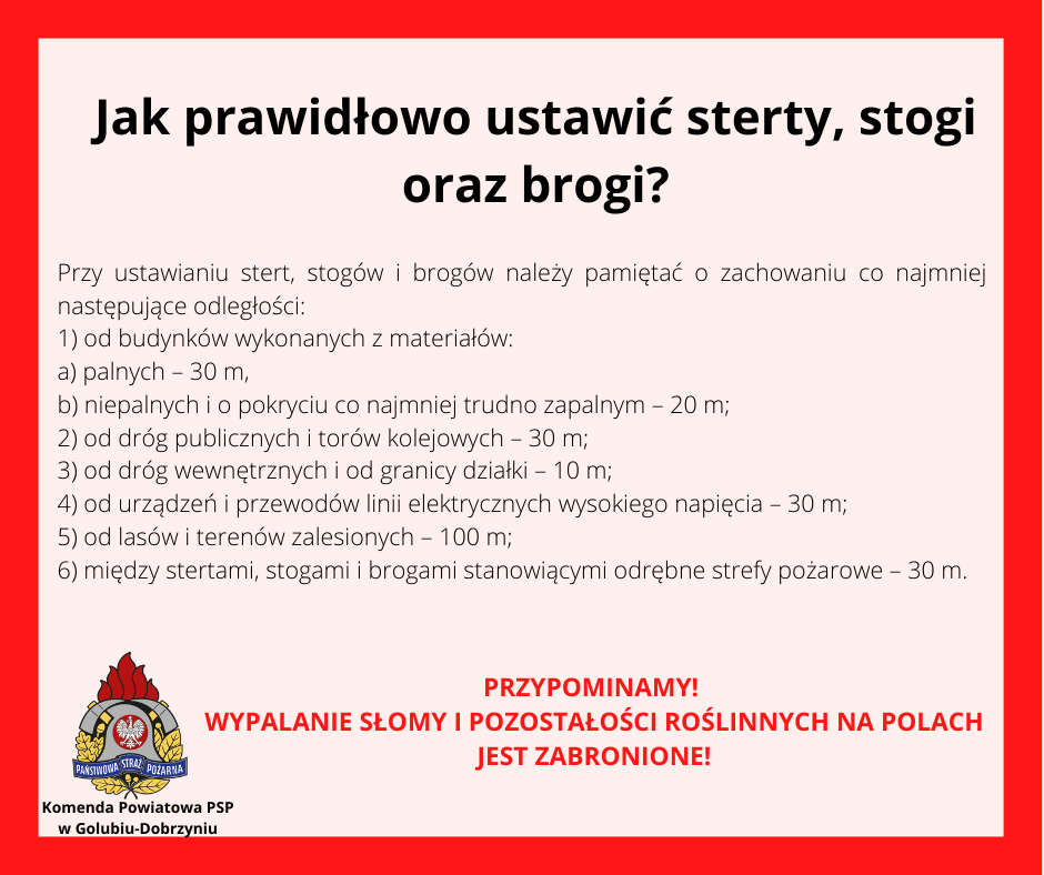 W związku z trwającymi żniwami, strażacy z Komendy Powiatowej Państwowej Straży Pożarnej w Golubiu-Dobrzyniu przypominają o zasadach prawidłowego stawiania stert, stogów oraz brogów.