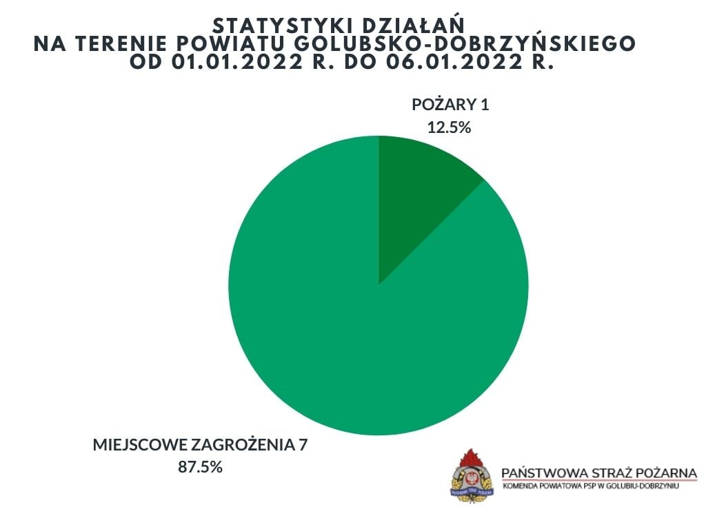 *Podsumowując działania ratowniczo-gaśnicze Komendy Powiatowej PSP w Golubiu-Dobrzyniu od 01.01.2022 r. do 06.01.2022 r. informujemy, iż odnotowaliśmy ogółem 8 zdarzeń z czego: 1 z nich stanowił pożar a 7 to miejscowe zagrożenia.
