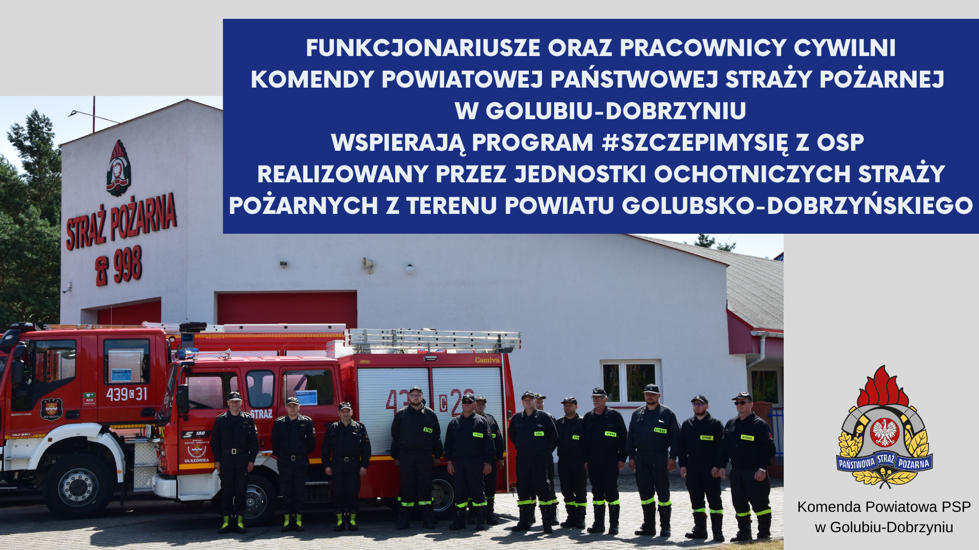 - Funkcjonariusze oraz pracownicy cywilni Komendy Powiatowej PSP w Golubiu-Dobrzyniu wspierają program #SzczepimySię z OSP realizowany przez jednostki Ochotniczych Straży Pożarnych z terenu Powiatu Golubsko-Dobrzyńskiego.