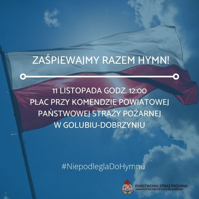 *W związku z obchodami 103 rocznicy odzyskania przez Polskę niepodległości zapraszamy osoby zainteresowane do wzięcia udziału w wydarzeniu #NiepodleglaDoHymnu -przyłącz się do akcji i zaśpiewaj Mazurka Dąbrowskiego ze strażakami z Komendy Powiatowej PSP w Golubiu-Dobrzyniu. Więcej informacji: https://www.facebook.com/events/313217540272738?ref=newsfeed