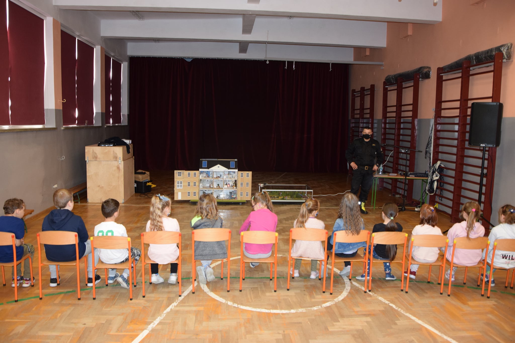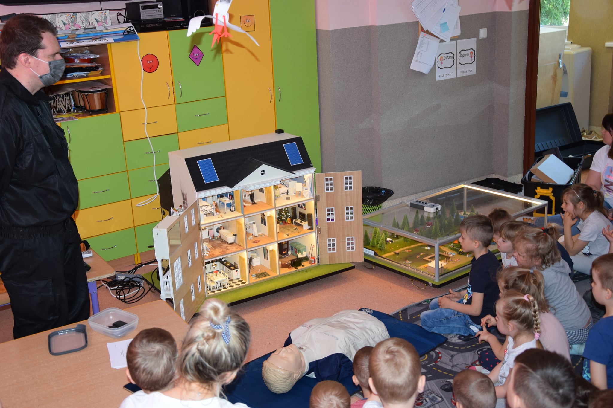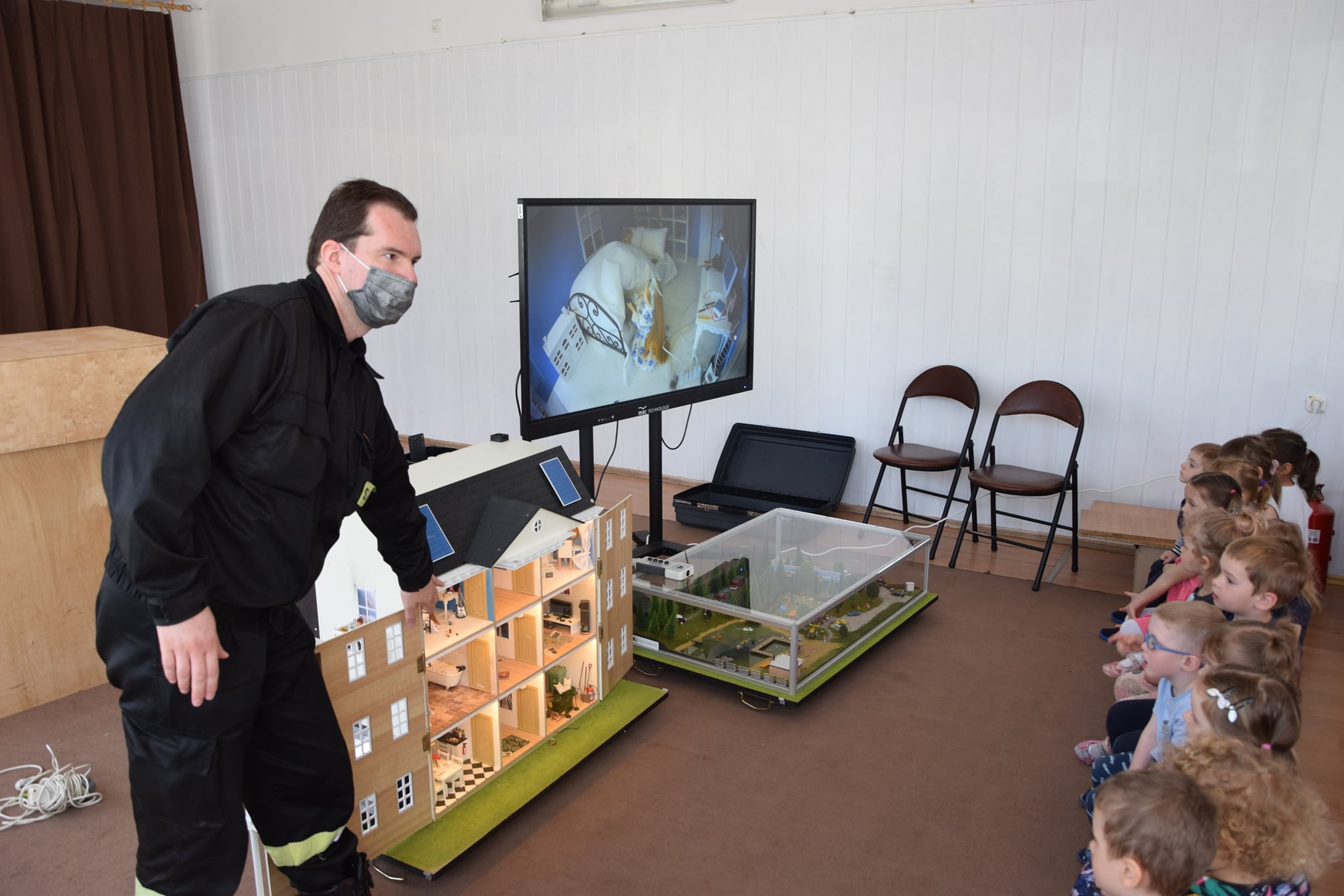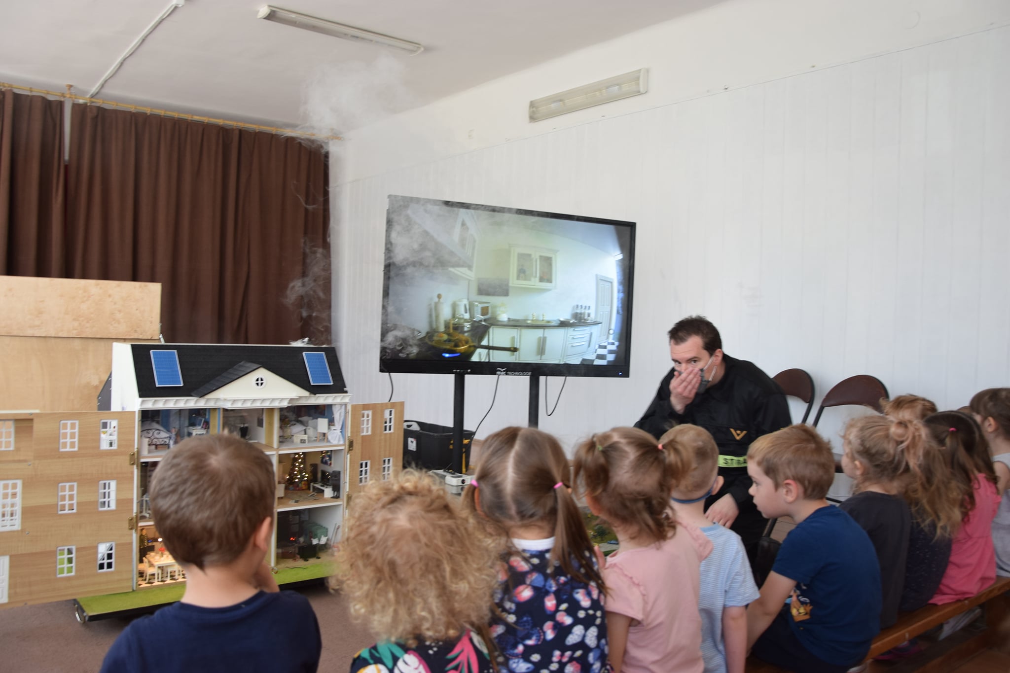 Bryg. Karol Cachnij oraz mł. asp. Kamil Żułtewicz przy użyciu symulatora zagrożeń pożarowych domu jednorodzinnego zaprezentowali dzieciom zagrożenia pożarowe a także inne niebezpieczne zdarzenia, do jakich może dojść w domu jednorodzinnym. Za pomocą efektów dźwiękowych i świetlnych oraz wydobywającego się sztucznego dymu w sposób realny oddali powagę i grozę sytuacji. Symulator składa się z trzech kondygnacji budynku, na których znajdują się realistycznie umeblowane i wyposażone pomieszczenia. Podczas pokazu zasymulowano zagrożenia mogące mieć miejsce, w pomieszczeniach takich jak: kuchnia, łazienka, pokój dziecięcy, sypialnia, salon oraz kotłownia. W poszczególnych pomieszczeniach domku były zainstalowane kamery, które umożliwiły dzieciom podgląd rozwoju zdarzeń.