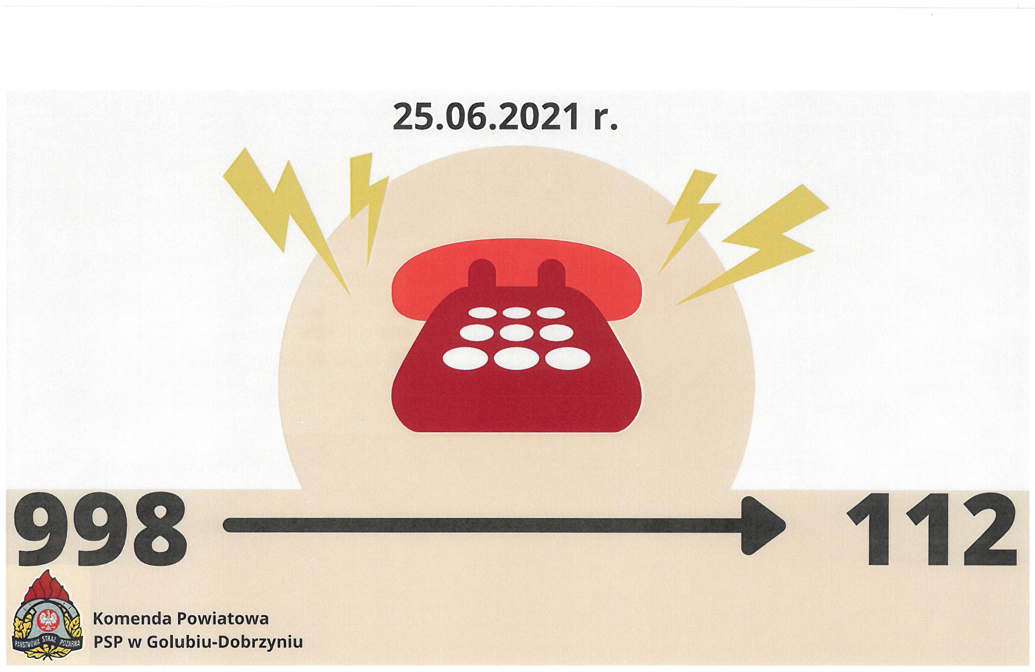 Przejęcie obsługi numeru alarmowego 998 przez Centrum Powiadamiania Ratunkowego w Bydgoszczy obsługującego numer alarmowy 112 dla powiatu golubsko-dobrzyńskiego nastąpi w dniu 25 czerwca 2021 r. o godz. 10:00.