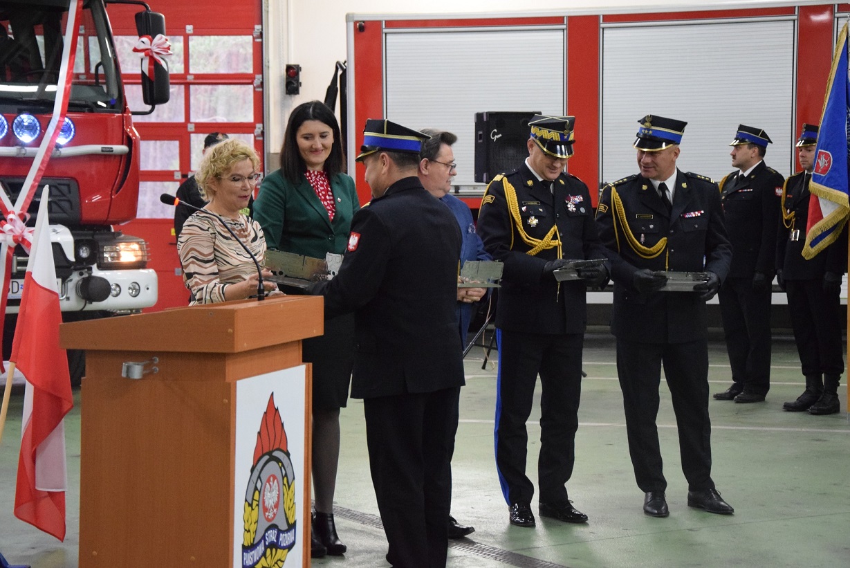 Uroczysta zbiórka była także okazją do tego aby podziękować wszystkim osobom, które przyczyniły się do pozyskania nowego pojazdu, a tym samym do poprawy poziomu bezpieczeństwa na terenie powiatu. Komendant Powiatowy PSP w Golubiu-Dobrzyniu sponsorom oraz gościom przekazał okolicznościowe pamiątki.
