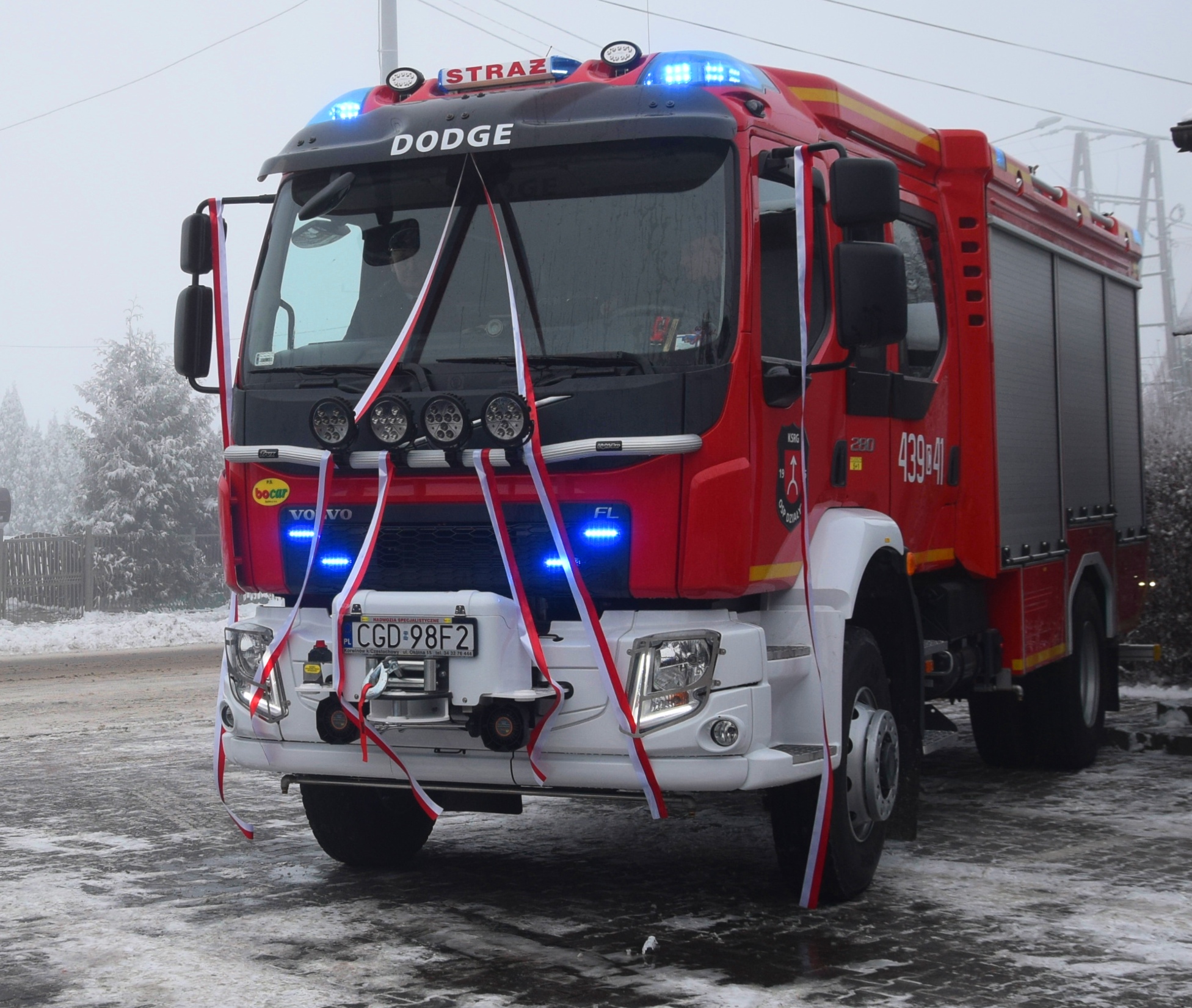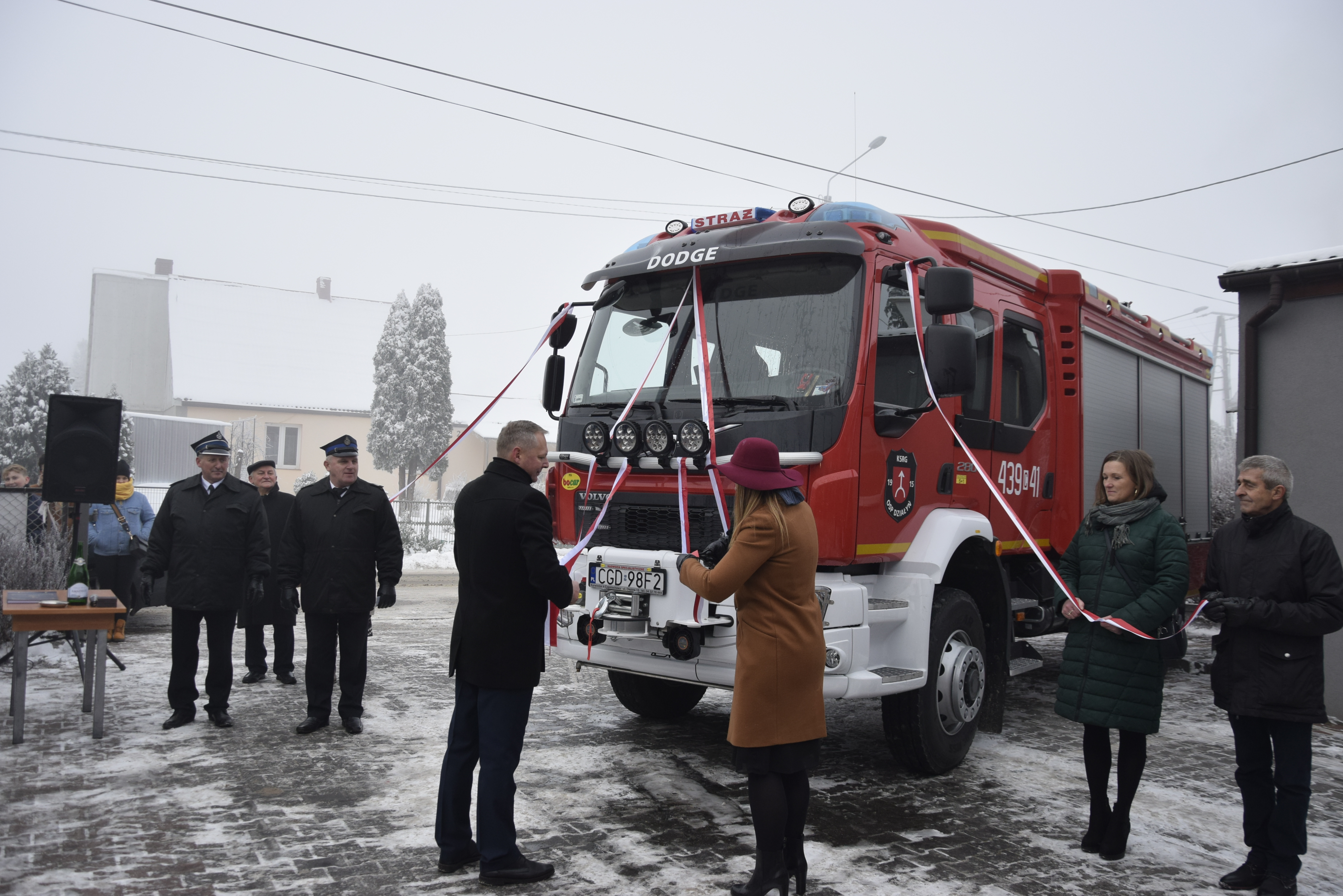 Nowy średni samochód ratowniczo-gaśniczy został poświęcony przez Księdza Kanonika Tomasza Muraszewskiego - Proboszcza Parafii Działyń i otrzymał imię ”DODGE”. Przekazania kluczyków oraz dowodu rejestracyjnego dokonali: Pani Joanna Borowiak – Poseł na sejm RP, Pan Józef Ramlau – Wicewojewoda Kujawsko-Pomorski oraz st. bryg. Jacek Kaczmarek – Kujawsko-Pomorski Komendant Wojewódzki PSP.