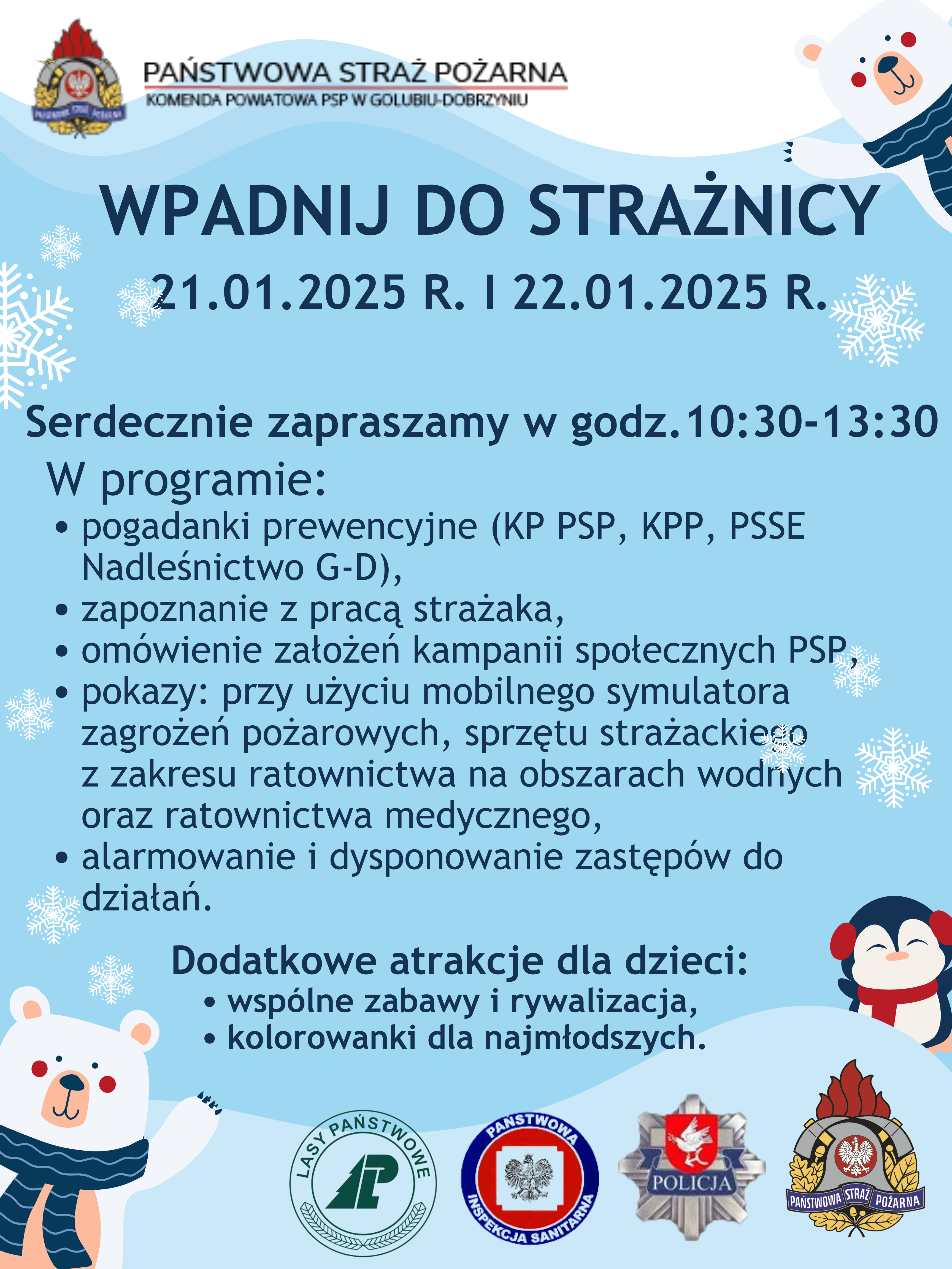 Już za tydzień w naszym województwie rozpoczną sie ferie zimowe. W ramach działań z zakresu prewencji społecznej przy współpracy z Powiatową Stacją Sanitarno-Epidemiologiczną w Golubiu-Dobrzyniu, Nadleśnictwem Golub-Dobrzyń oraz Komendą Powiatową Policji w Golubiu-Dobrzyniu organizujemy akcję „Wpadnij do strażnicy”.