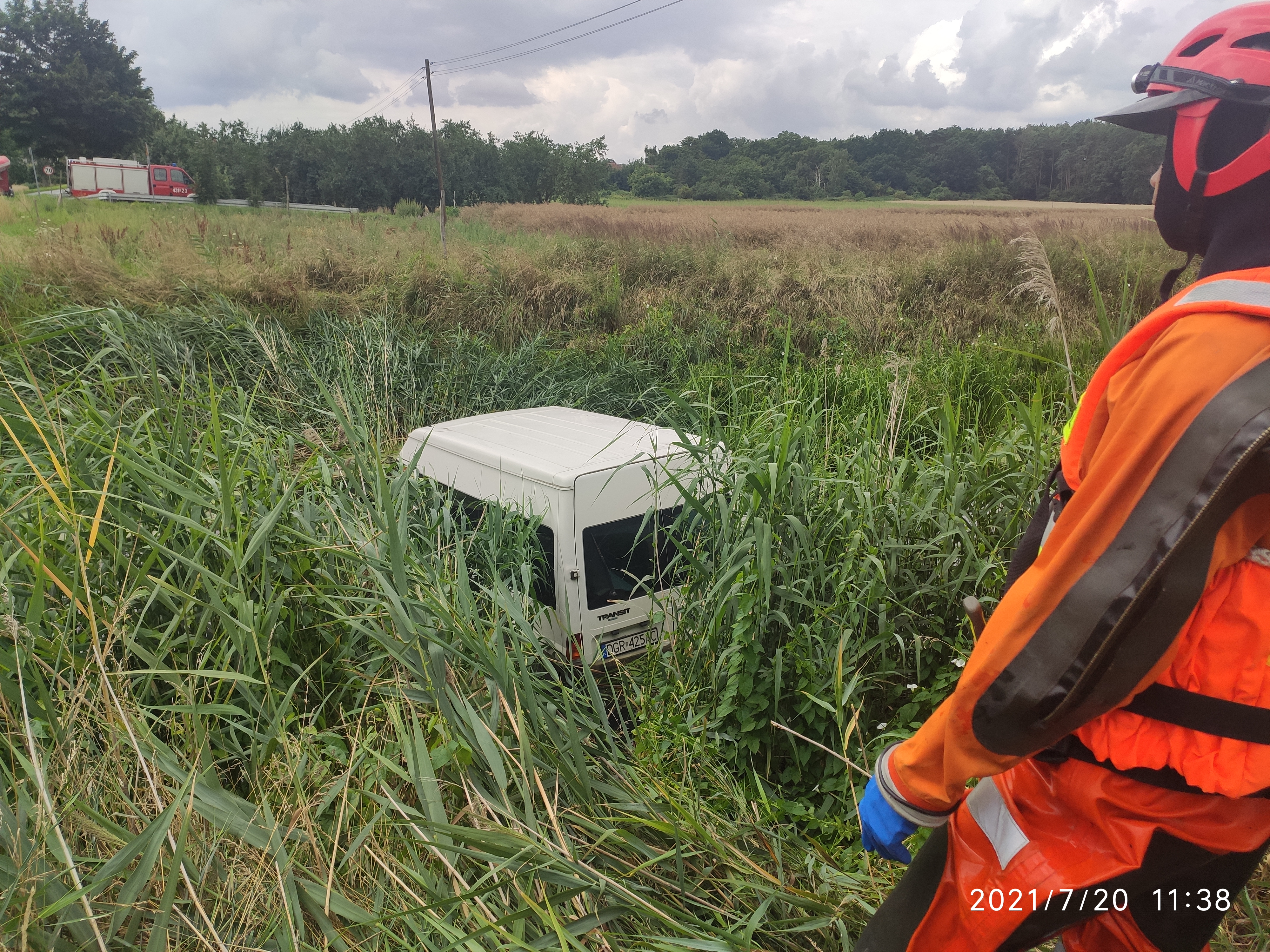 W dniu 20 lipca 2021 r. do Stanowiska Kierowania Komendanta Powiatowego PSP w Górze wpłynęło zgłoszenie od funkcjonariusza Policji o wypadku busa osobowego, który wpadł do cieku wodnego Rów Śląski. Pojazd do wysokości 1 metra znajdował się w wodzie. Przybyłe na miejsce zastępy zabezpieczyły teren akcji, przystąpiły do kierowania ruchem drogowym i sprawdziły pojazd pod kątem ewentualnie przybywających w nim osób bądź wycieków substancji ropopochodnych. Na tym działania zakończono.