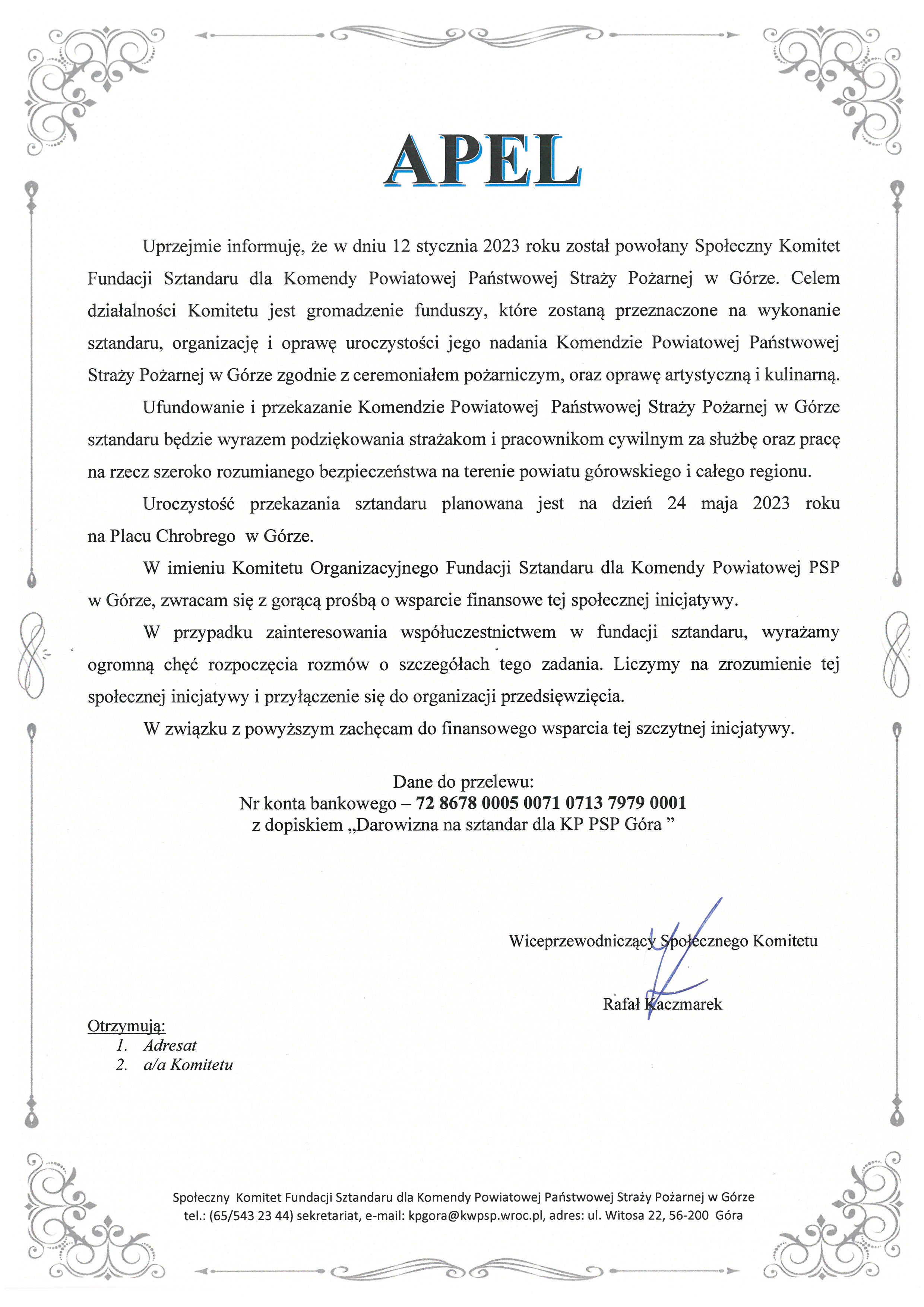 Uprzejmie informuję, że w dniu 12 stycznia 2023 roku został powołany Społeczny Komitet Fundacji Sztandaru dla Komendy Powiatowej Państwowej Straży Pożarnej w Górze. Celem działalności Komitetu jest gromadzenie funduszy, które zostaną przeznaczone na wykonanie sztandaru, organizację i oprawę uroczystości jego nadania Komendzie Powiatowej Państwowej Straży Pożarnej w Górze zgodnie z ceremoniałem pożarniczym, oraz oprawę artystyczną i kulinarną.