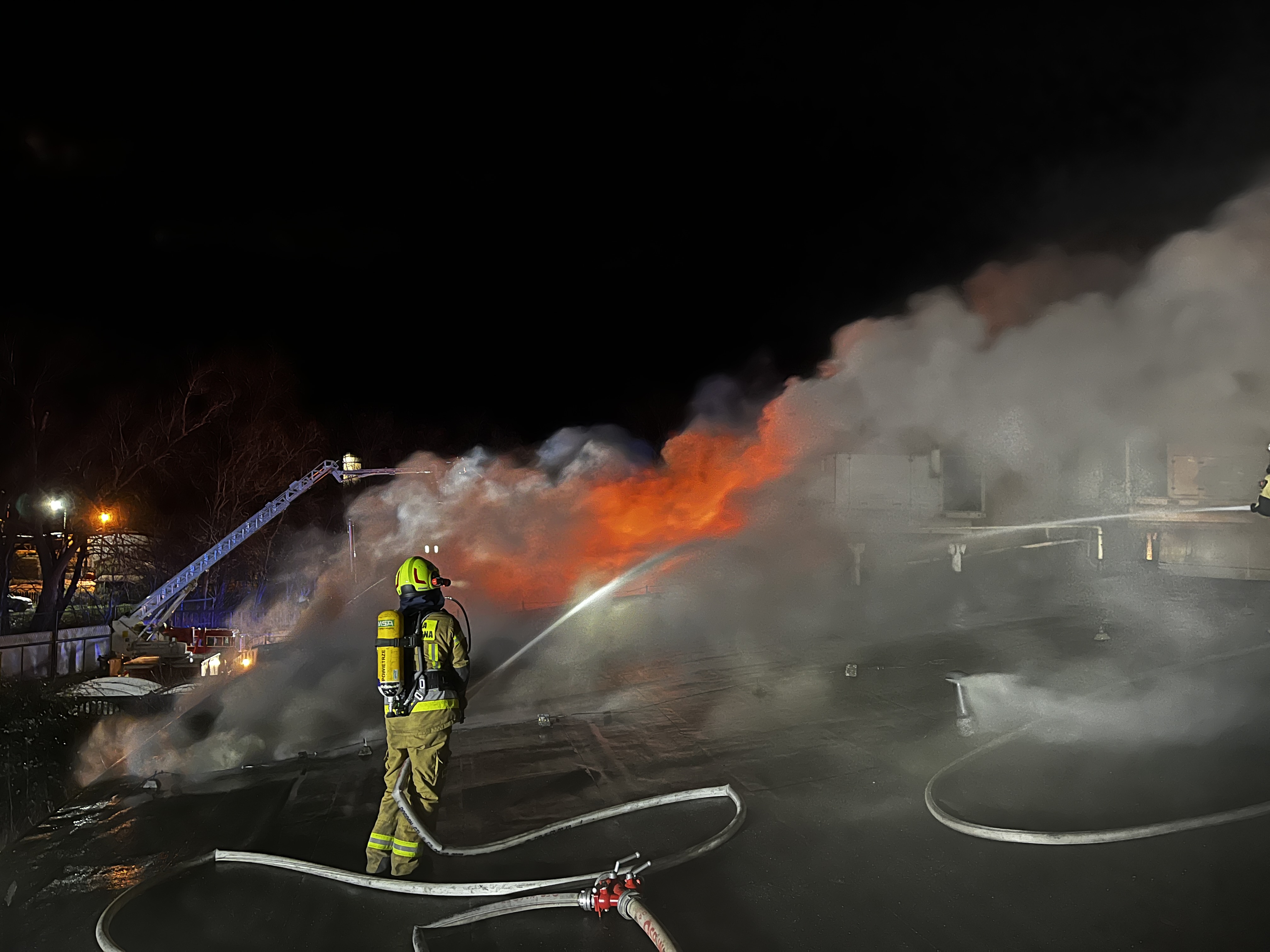 W dniu 4 stycznia 2024 r. o godzinie 17. 01 do SK KP PSP w Górze wpłynęło zgłoszenie o pożarze pomieszczenia wędzarni przy lokalu handlowym usytuowanym w Górze przy ul. Dworcowej. W pierwszej fazie do działań zadysponowano 2 zastępy z JRG Góra. Po przyjeździe na miejsce pożaru, podano prąd wody do wnętrza palącej się wędzarni. Stwierdzono także, że pożar rozprzestrzenił się na belki w przestrzeni międzystropowej. Dysponowano kolejne siły i środki. Strażacy w celu dotarcia do źródeł ognia wykonywali otwory w dachu i podawali prądy gaśnicze, z drabin mechanicznych i podnośników hydraulicznych na palącą się konstrukcję oraz do wnętrza budynku. Z uwagi na silny wiatr pożar rozprzestrzeniał się w głąb konstrukcji dachu. Część dachu uległa zawaleniu do wnętrza budynku. W celu zapewnienia ciągłości podawania wody, rozstawiono zbiornik brezentowy, z którego zasilano pojazdy prowadzące działania w natarciu. W kulminacyjnym momencie podawano 4 prądy gaśnicze z dachu budynku, 3 prądy gaśnicze z drabin mechanicznych oraz 2 prądy gaśnicze do wnętrza budynku. O godz. 5.28 pożar przestał się rozprzestrzeniać. W działaniach uczestniczyły 24 zastępy z terenu powiatu górowskiego, leszczyńskiego, głogowskiego trzebnickiego, polkowickiego, lubińskiego, wschowskiego i wrocławskiego. Na chwilę obecną trwają działania dogaszające. W wyniku pożaru zniszczeniu i spaleniu uległ lokal handlowy wraz z asortymentem, ok. 80 % dachu uległo zawaleniu. Nie dopuszczono do rozprzestrzenienia się ognia na pozostałe 3 lokale handlowe.