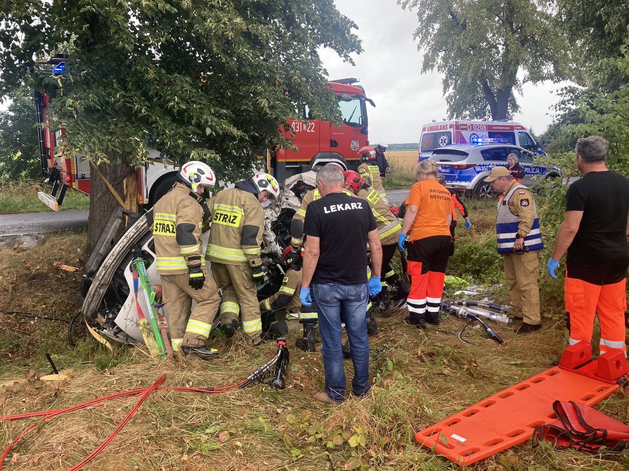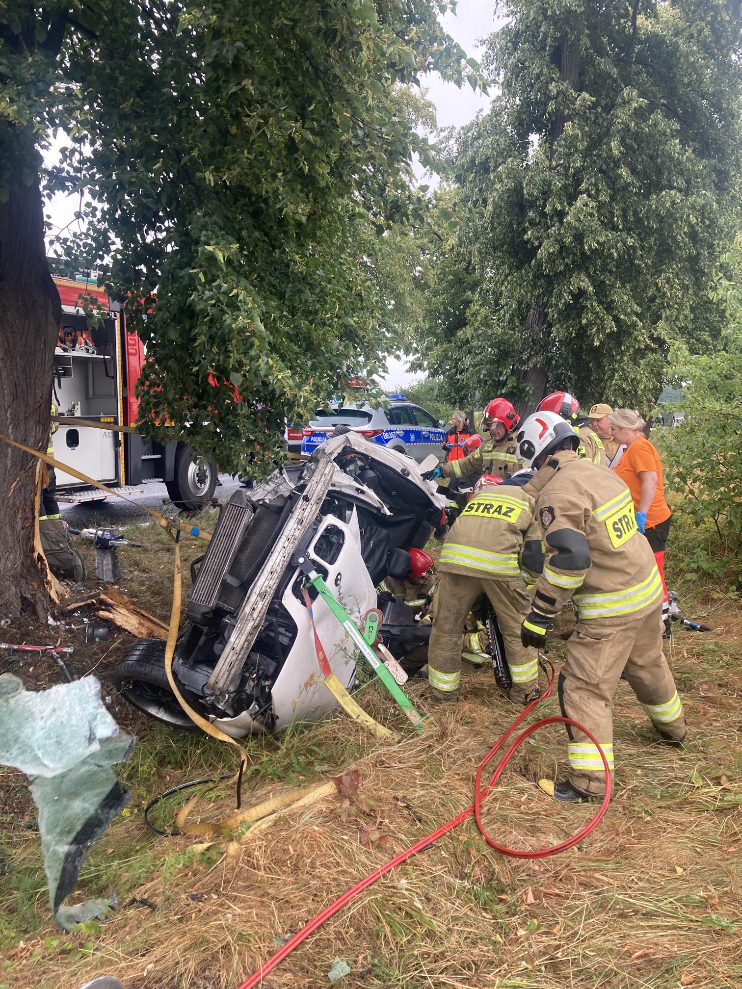 Po przyjeździe na miejsce zdarzenia okazało się, że kierowca samochodu osobowego marki BMW poruszając się drogą powiatową uderzył w przydrożne drzewo i znajduje się przytomny we wnętrzu pojazdu.