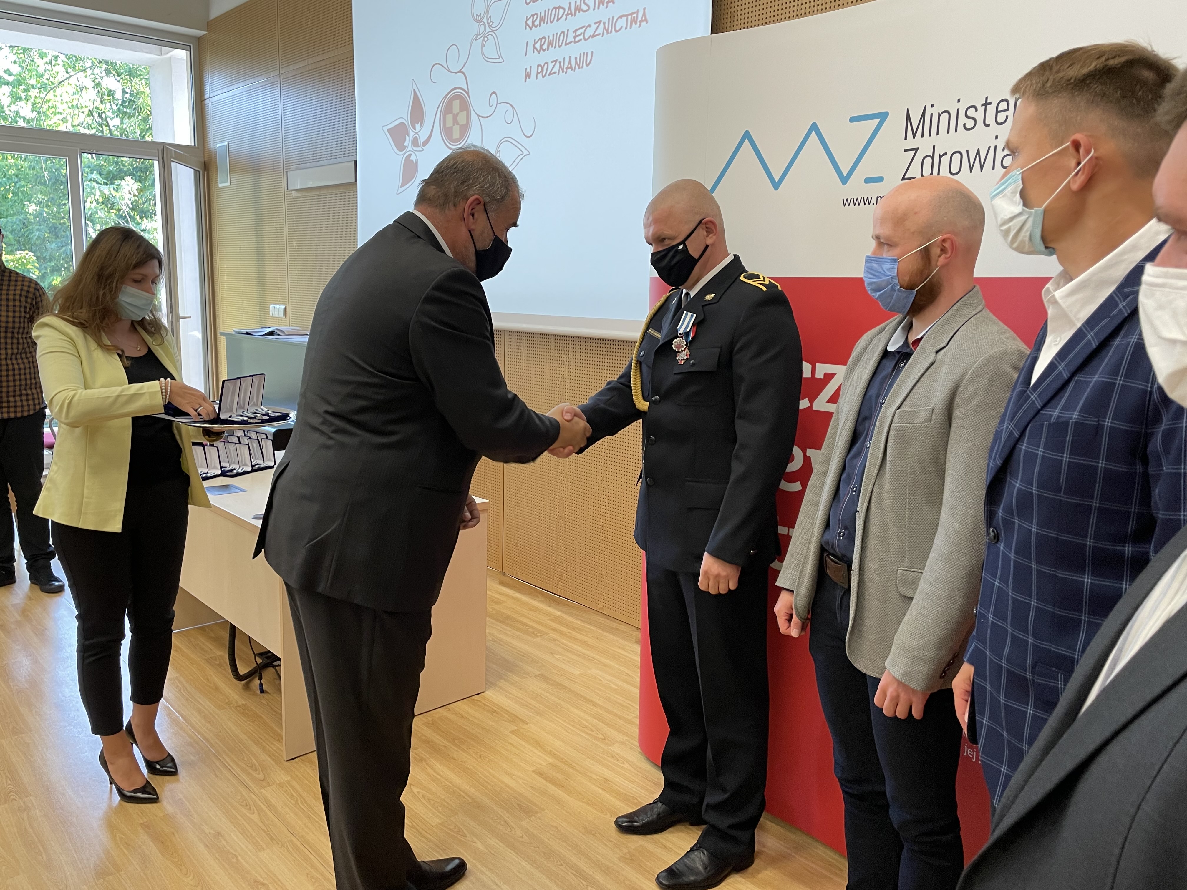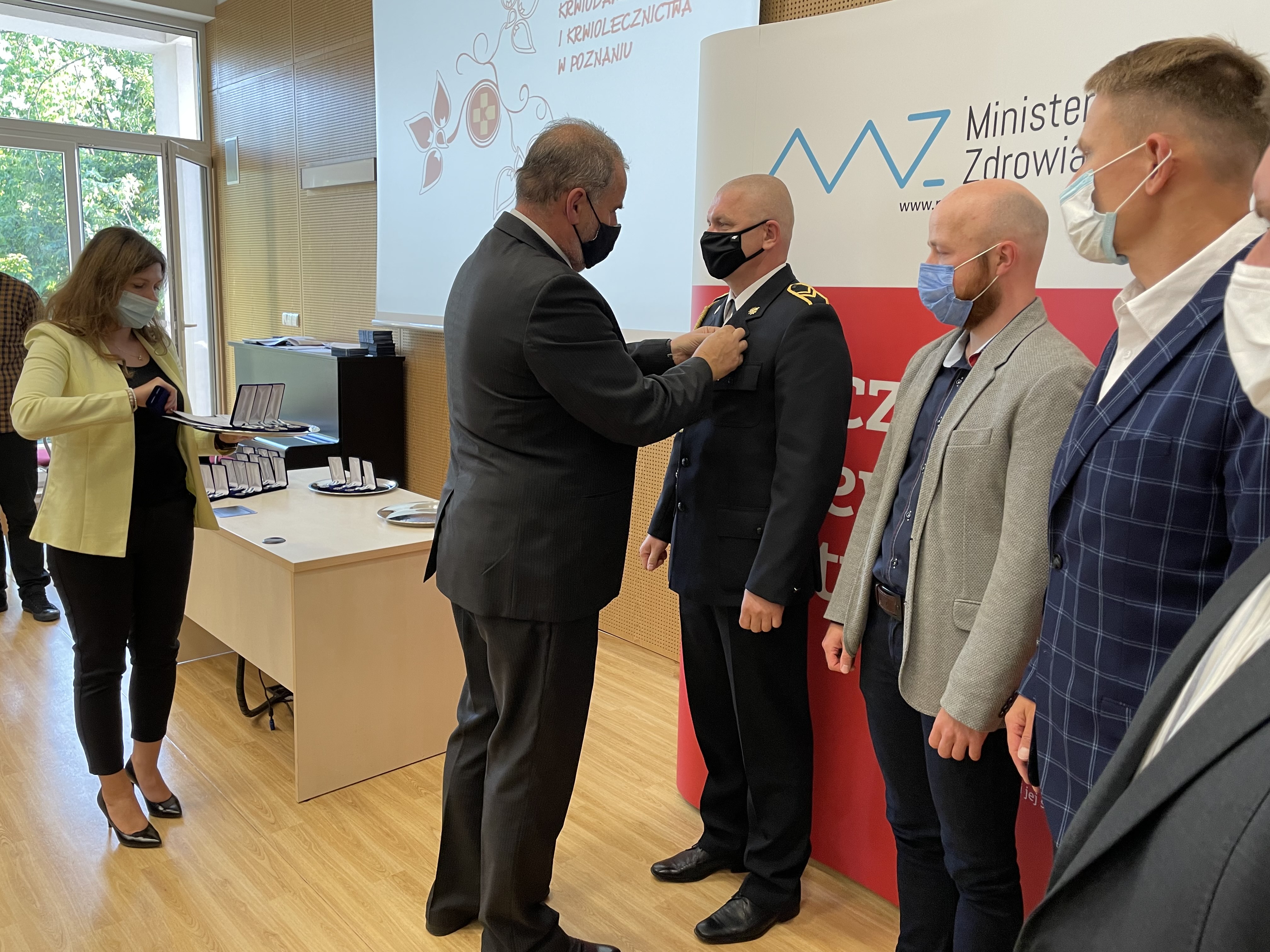 W dniu 8 września 2021 roku o godz. 17:00 w Regionalnym Centrum Krwiodawstwa i Krwiolecznictwa w Poznaniu zostały wręczone odznaki Ministra Zdrowia ,,Honorowy Dawca Krwi – Zasłużony dla Zdrowia Narodu”. Odznaki są wręczane honorowym dawcą krwi, którzy oddali co najmniej 20 litrów krwi. Taką odznakę z rąk zastępcy dyrektora RCKiK w Poznaniu Pana Romana Klupieć otrzymał nasz kolega st. ogn. Wojciech Skarłubowicz. Wojtek honorowo krew oddaje od 1999 r. i do tej pory oddał już ponad 26 litrów tego cennego daru.