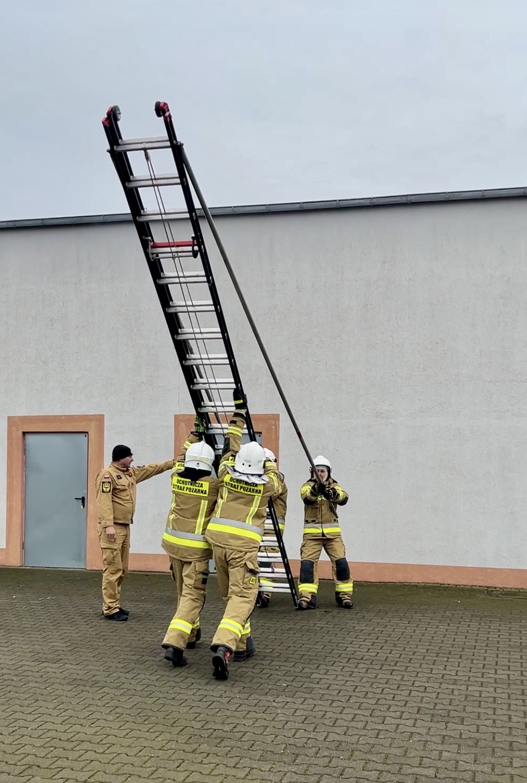 Dziś w naszej jednostce odbył się kolejny etap Szkolenia Podstawowego Strażaka Ratownika OSP, podczas którego druhny i druhowie rozwijali swoje umiejętności w kluczowych obszarach bezpieczeństwa i działań ratowniczo-gaśniczych. Był to dzień pełen wiedzy, praktyki i pracy zespołowej, a omawiane zagadnienia należą do fundamentów strażackiej służby. Jednym z głównych punktów szkolenia był sprzęt ochrony dróg oddechowych. Podkreślono, jak kluczową rolę pełni poprawna ten sprzęt podczas działań w atmosferach niebezpiecznych i jak ważna jest praca w rotach oraz ciągła komunikacja. Połączono temat pracy w aparatach ODO z taktyką prowadzenia działań gaśniczych. Omówiono różnice pomiędzy pożarami wewnętrznymi a zewnętrznymi, dynamikę rozwoju pożaru oraz techniki bezpiecznego wejścia do obiektu. Instruktorzy przypomnieli także o zagrożeniach takich jak rozgorzenie, backdraft czy wsteczny ciąg płomienia, a także o właściwym doborze prądów gaśniczych i organizacji pracy zastępu. Ponadto omawiano techniki przeszukania pomieszczeń, organizację linii gaśniczych wspierających ratowników, a także komunikację w warunkach ograniczonej widoczności. To jeden z najważniejszych elementów szkolenia, bezpośrednio przekładający się na bezpieczeństwo życia ludzkiego. Dodatkowym tematem była obsługa drabin przenośnych. W praktycznej części szkolenia uczestnicy doskonalili pracę z drabinami pożarniczymi przenośnymi – ich budowę, zasady noszenia, stawiania i zabezpieczania.