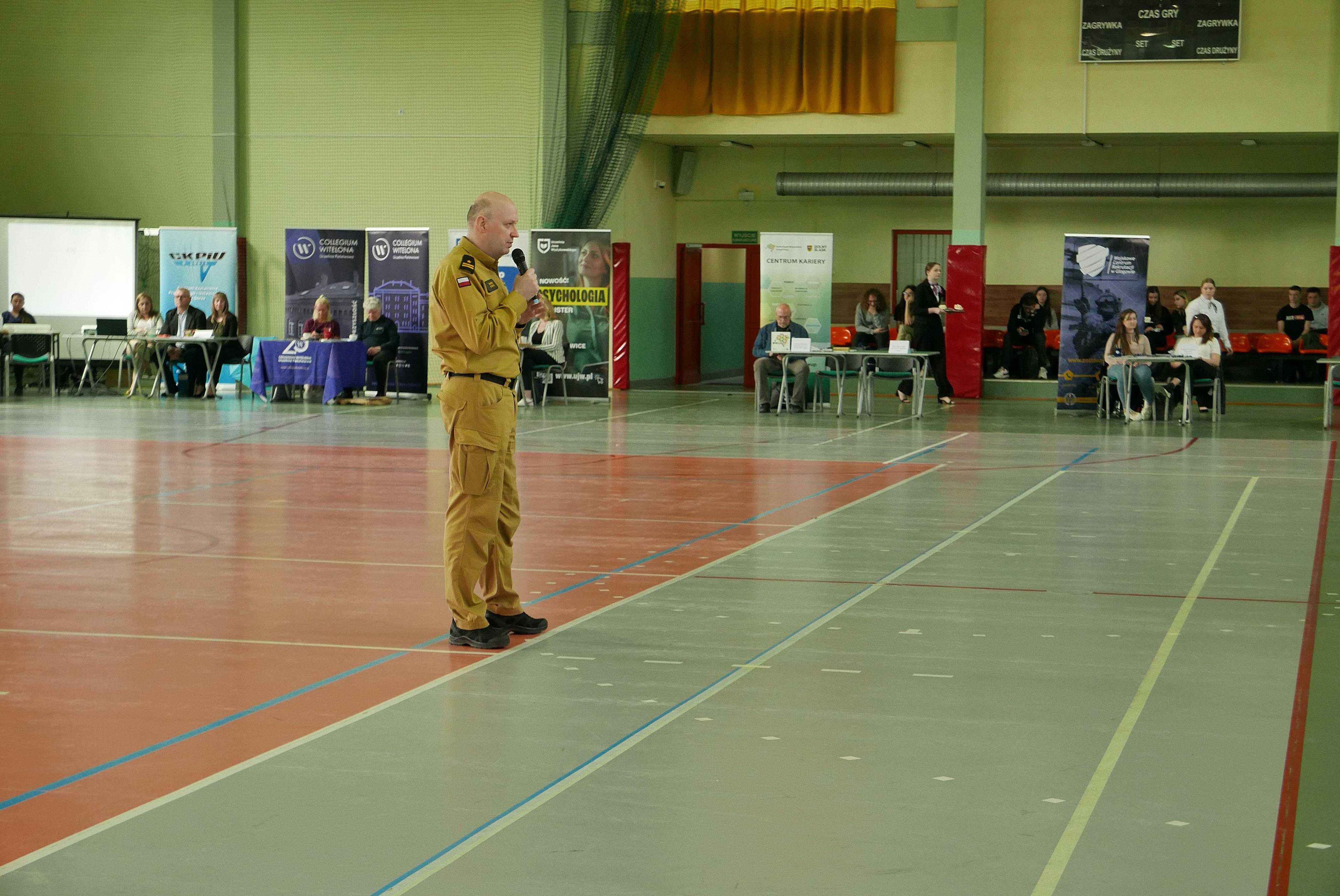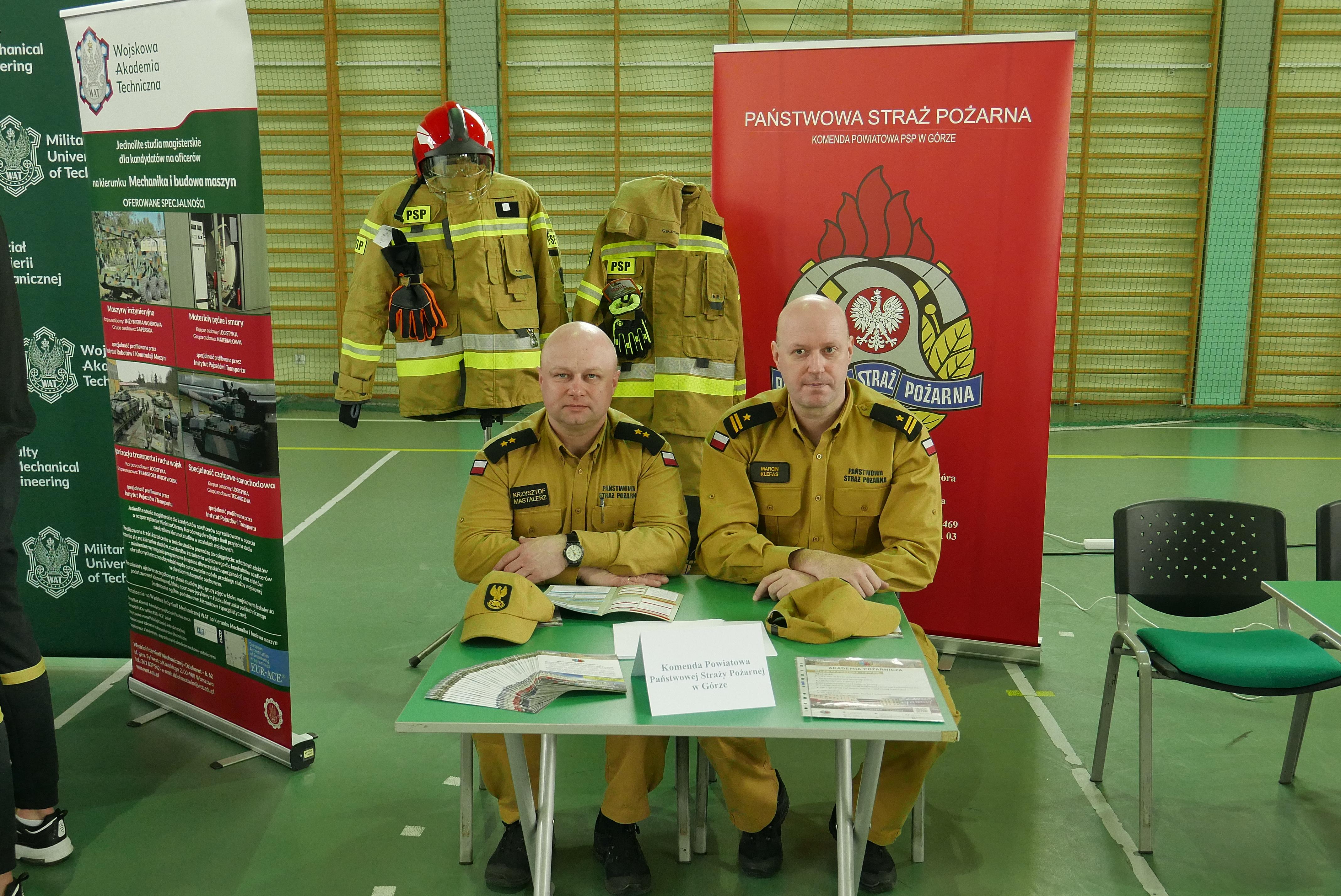 Mł. bryg. Marcin Klefas oraz mł. kpt. Krzysztof Mastalerz z KP PSP w Górze uczestniczyli w dniu 12 kwietnia 2024 r. w Targach Edukacyjnych zorganizowanych w Hali sportowej ,,Arkadia” w Górze. Na targach prezentowały się szkoły i uczelnie przedstawiając swoją ofertę edukacyjną, a także instytucje pomagające uczniom podjąć decyzje o wyborze dalszego kierunku kształcenia. W trakcie targów funkcjonariusze przedstawili ofertę edukacyjną Akademii Pożarniczej w Warszawie oraz szkół aspirantów znajdujących się w kraju oraz odpowiadali na pytania szczegółowe uczniów uczestniczących w wydarzeniu.