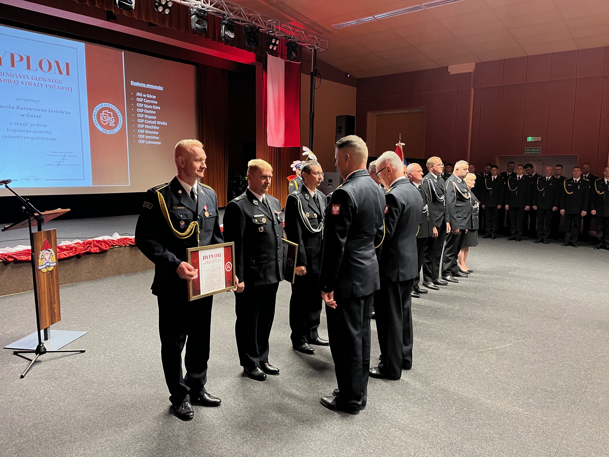 Następnie z okazji 30-lecia utworzenia Krajowego Systemu Ratowniczo-Gaśniczego, wręczono okolicznościowe dyplomy dla Jednostki Ratowniczo-Gaśniczej w Górze oraz jednostek OSP z terenu powiatu górowskiego wchodzących w skład systemu.