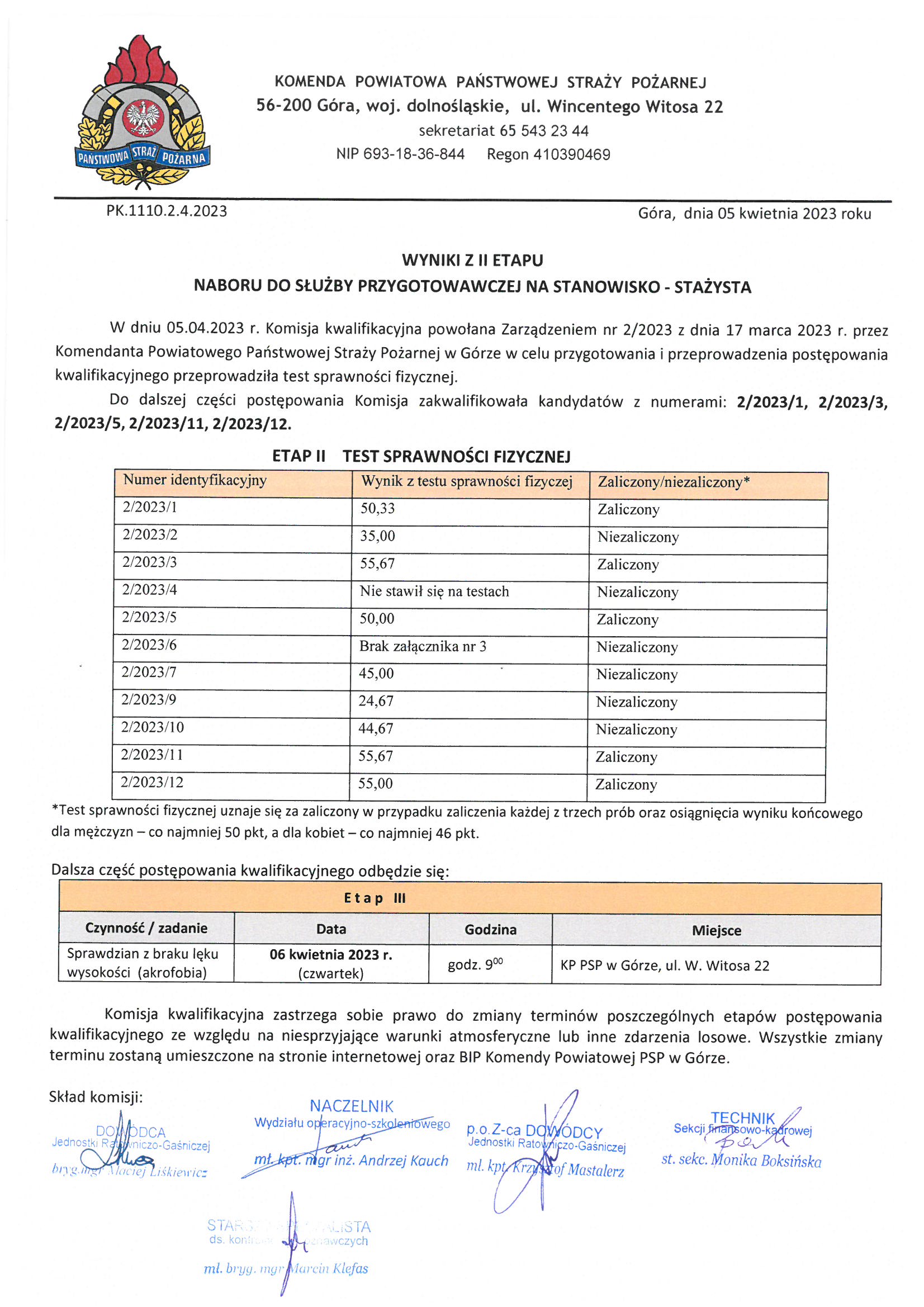 Wyniki z II etapu naboru nr 2-2023 do służby w KP PSP w Górze