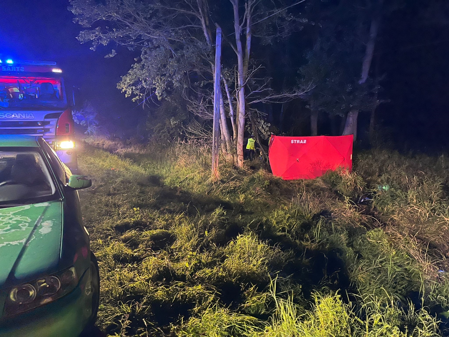 W dniu 2 września 2023 r. o godz. 21.42 do SK KP PSP w Górze wpłynęło zgłoszenie o wypadku w miejscowości Chobienia z udziałem dwóch pojazdów. Po przyjeździe na miejsce zdarzenia pierwszych zastępów okazało się, że na poboczu drogi znajduje się uszkodzony jeden z pojazdów, przy którym znajduje się kierowca bez obrażeń, a drugi samochód leży na dachu, w którym znajdują się 2 osoby. Strażacy zabezpieczyli teren działań, przy pomocy narzędzi hydraulicznych ewakuowali osoby poszkodowane z uszkodzonego pojazdu. Pasażer został przekazany dla Lotniczego Pogotowia Ratunkowego, natomiast u kierującego samochodem, będący na miejscu lekarz stwierdził zgon. Na miejsce zdarzenia przybył zastępca komendanta powiatowego PSP w Górze oraz prokurator, który prowadził czynności dochodzeniowe. W sumie do działań zadysponowano 7 zastępów straży pożarnych w sile 29 strażaków. Przypuszczalną przyczyną zdarzenia było niezachowanie zasad bezpieczeństwa ruchu środków transportu.