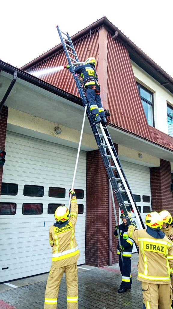 Egzamin składał się z części teoretycznej tj. testu sprawdzającego poziom zdobytej wiedzy oraz części praktycznej, na którą składały się: obsługa aparatu powietrznego, znajomość sprzętu pożarniczego, użycie rzutki ratowniczej, wydobywanie osoby poszkodowanej z samochodu osobowego oraz ćwiczenie praktyczne z zakresu taktyki działań gaśniczych z użyciem drabiny D-10W.