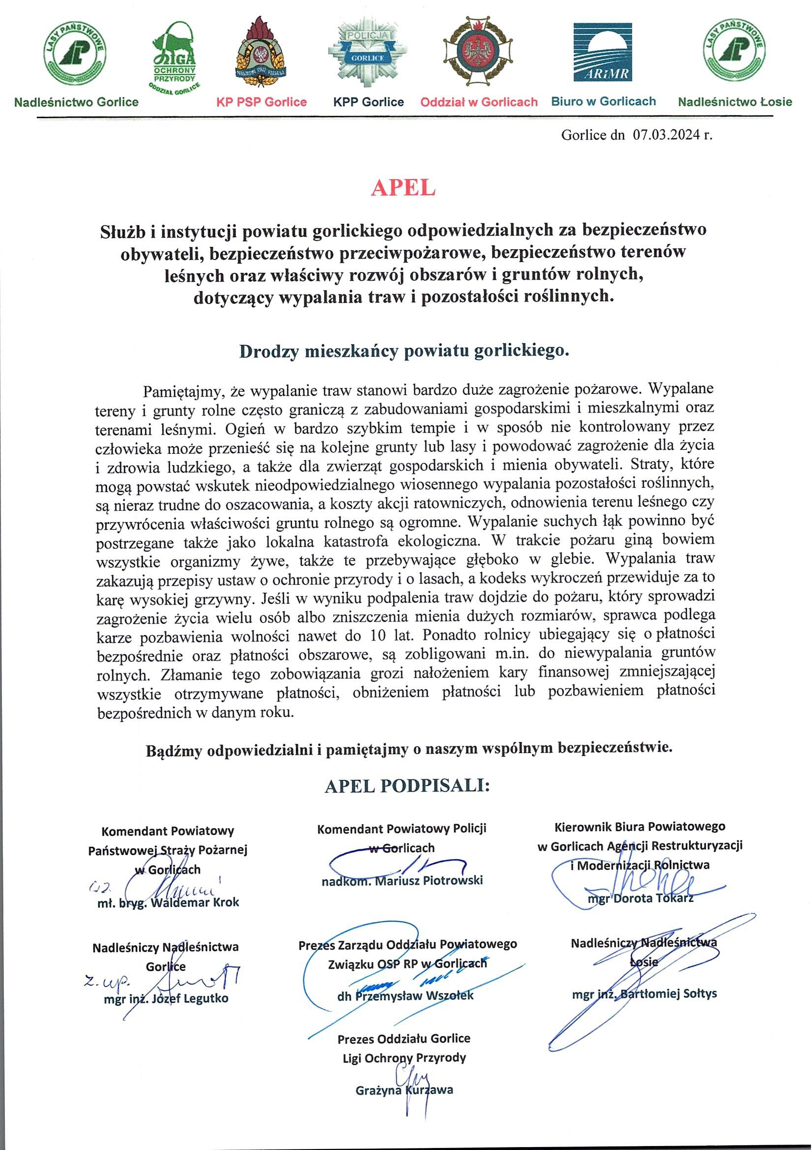 Na zakończenie spotkania Komendant Powiatowy Policji w Gorlicach nadkom. Mariusz Piotrowski, Zastępca Komendanta Powiatowego Państwowej Straży Pożarnej w Gorlicach mł. bryg. Piotr Ostrowski, Prezes Zarządu Oddziału Powiatowego Związku Ochotniczych Straży Pożarnych Rzeczypospolitej Polskiej dh Przemysław Wszołek, Nadleśniczy Nadleśnictwa Łosie mgr inż. Bartłomiej Sołtys, Inżynier Nadzoru Nadleśnictwa Gorlice mgr inż. Mirosław Sternik, a także Kierownik Powiatowego Biura Agencji Restrukturyzacji i Modernizacji Rolnictwa w Gorlicach Pani mgr Dorota Tokarz i Prezes Oddziału Gorlice Ligi Ochrony Przyrody Pani Grażyna Kurzawa, podpisali apel do wszystkich mieszkańców powiatu gorlickiego, który brzmi następująco: