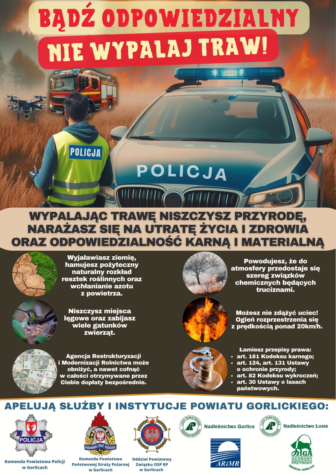 Z uwagi na nadchodzący okres wiosenny, który wiąże się z ociepleniem i wysuszeniem pokrywy gleby wraz z zalegającą na niej dużą ilością suchych pozostałości roślinnych instytucje powiatu gorlickiego odpowiedzialne za bezpieczeństwo obywateli, bezpieczeństwo przeciwpożarowe, bezpieczeństwo terenów leśnych oraz właściwy rozwój obszarów i gruntów rolnych zwracają się z apelem o zaprzestanie wiosennego wypalania traw.