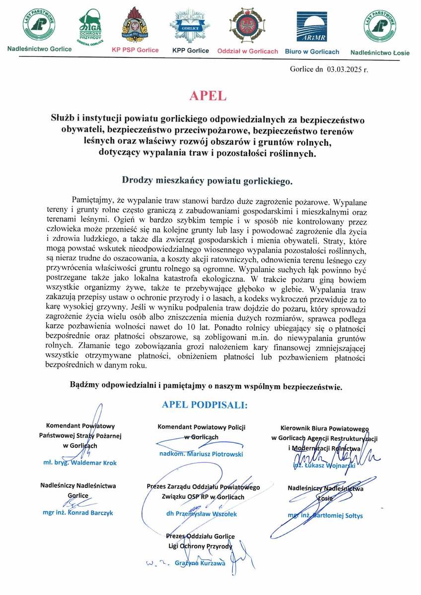 Na zakończenie spotkania Komendant Powiatowy Policji w Gorlicach nadkom. Mariusz Piotrowski, Komendant Powiatowy Państwowej Straży Pożarnej w Gorlicach mł. bryg. Waldemar Krok, Prezes Zarządu Oddziału Powiatowego Związku Ochotniczych Straży Pożarnych Rzeczypospolitej Polskiej dh Przemysław Wszołek, Nadleśniczy Nadleśnictwa Łosie mgr inż. Bartłomiej Sołtys, Nadleśniczy Nadleśnictwa Gorlice mgr inż. Konrad Barczyk, a także Kierownik Powiatowego Biura Agencji Restrukturyzacji i Modernizacji Rolnictwa w Gorlicach inż. Łukasz Wojnarski i Prezes Oddziału Gorlice Ligi Ochrony Przyrody Pani Grażyna Kurzawa, podpisali apel do wszystkich mieszkańców powiatu gorlickiego, który brzmi następująco:
