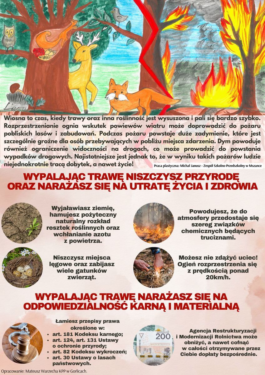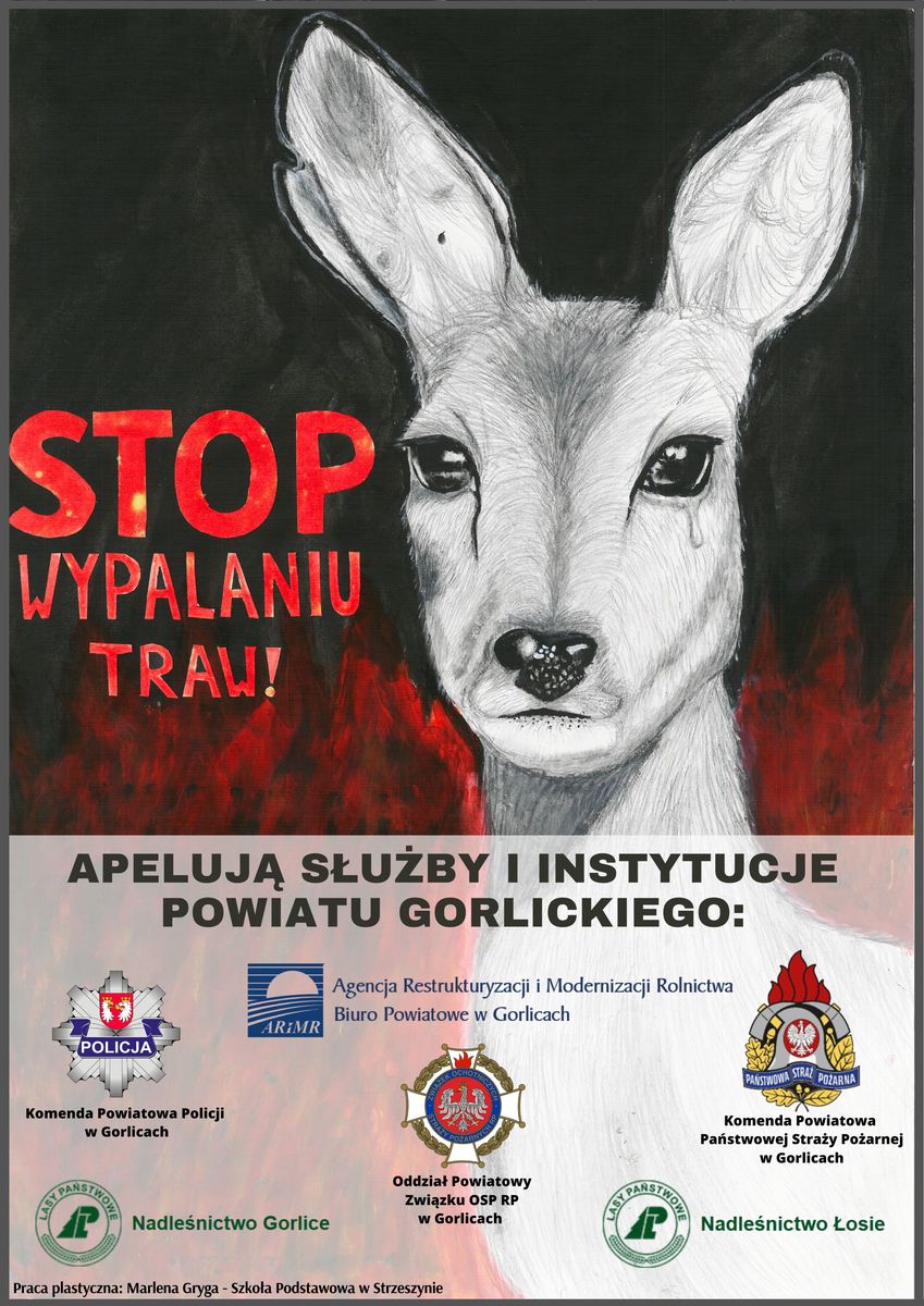 Z uwagi na nadchodzący okres wiosenny, który wiąże się z ociepleniem i wysuszeniem pokrywy gleby wraz z zalegającą na niej dużą ilością suchych pozostałości roślinnych instytucje powiatu gorlickiego odpowiedzialne za bezpieczeństwo obywateli, bezpieczeństwo przeciwpożarowe, bezpieczeństwo terenów leśnych oraz właściwy rozwój obszarów i gruntów rolnych zwracają się z apelem o zaprzestanie wiosennego wypalania traw.