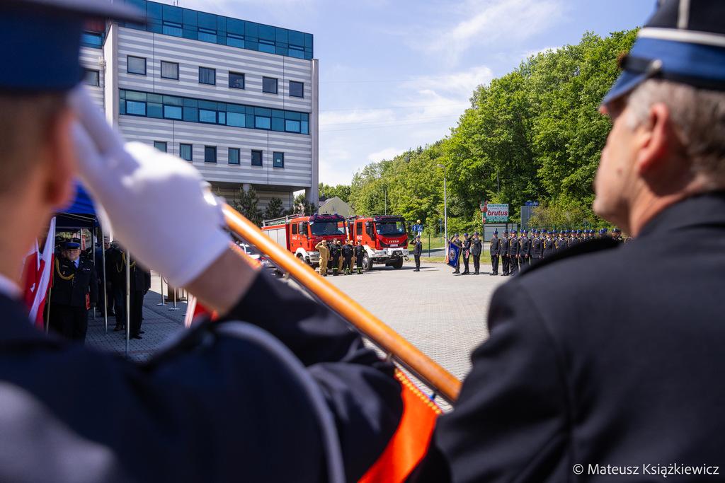 Uroczysty apel rozpoczął się od złożenia meldunku przez dowódcę uroczystości kpt. Konrada Łukaszyka Zastępcy Małopolskiego Komendanta Wojewódzkiego st. bryg. Piotrowi Gadowskiemu oraz podniesienia flagi biało czerwonej na maszt i odegranie hymnu Rzeczypospolitej Polskiej.