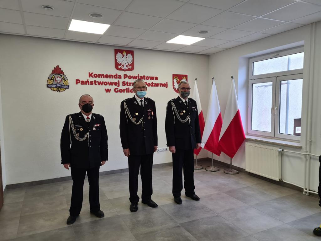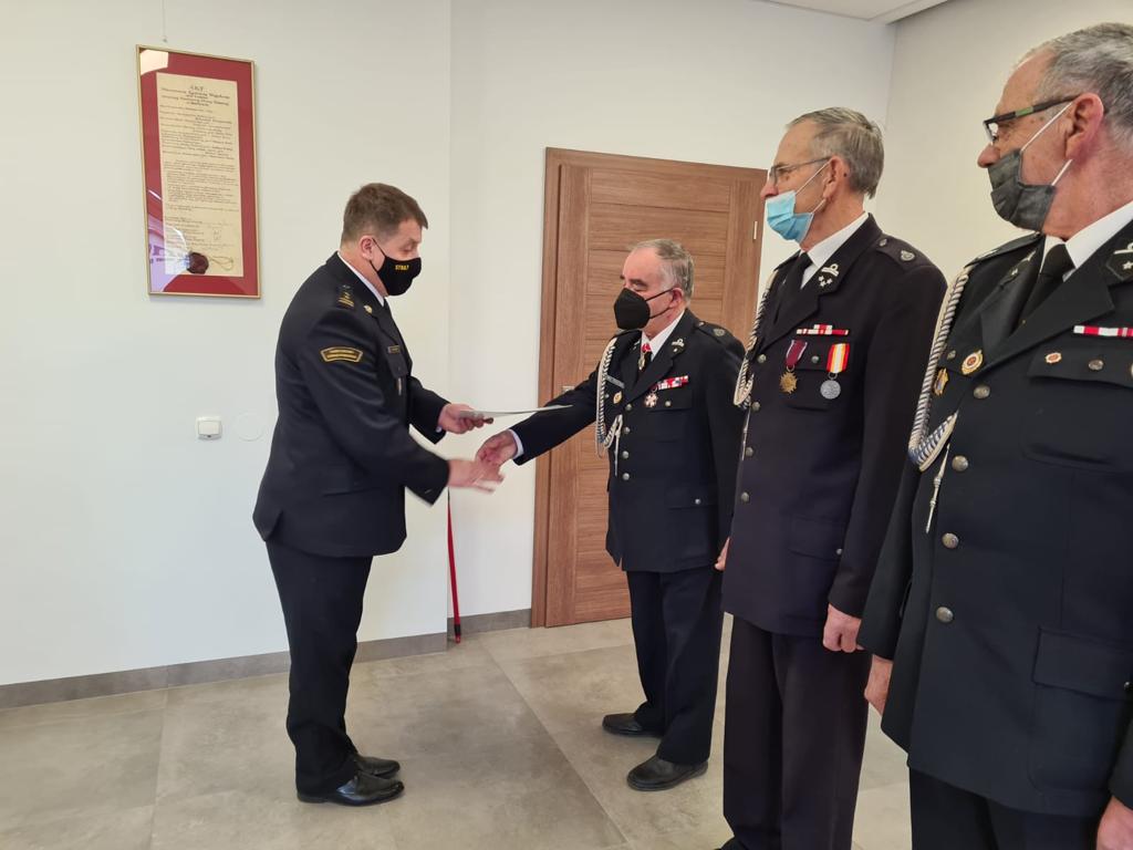 28.02.2022r. w Komendzie Powiatowej Państwowej Straży Pożarnej w Gorlicach odbyła się uroczystość wręczenia Decyzji o przyznaniu świadczenia ratowniczego dla druhów z Ochotniczych Straży Pożarnych z powiatu gorlickiego. Podczas uroczystej zbiórki bryg. Krzysztof Gładysz Komendant Powiatowy PSP w Gorlicach podziękował druhom za ich służbę na przecz ochrony przeciwpożarowej oraz wręczył emerytowanym strażakom OSP Decyzje o przyznaniu świadczenia ratowniczego.