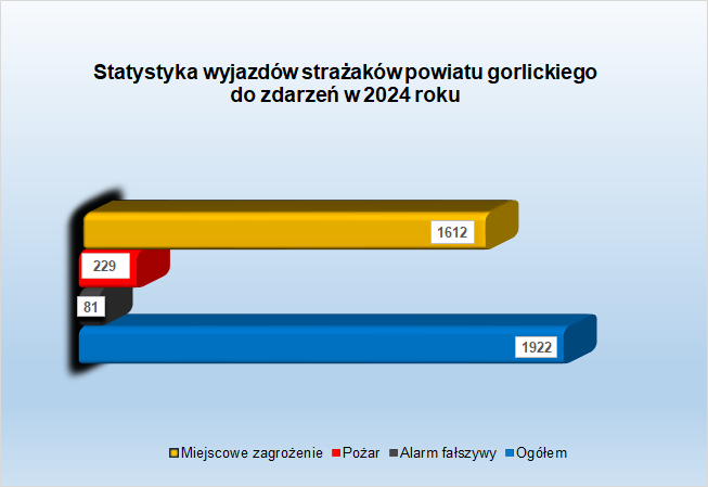 W 2024 r. strażacy z powiatu gorlickiego wyjeżdżali do zdarzeń 1922 razy, w tym do 1612 miejscowych zagrożeń, 229 pożarów oraz 81 alarmów fałszywych. Ilość zdarzeń ogółem wzrosła o 621 w porównaniu z 2023 rokiem to wzrost interwencji o 47,73%.